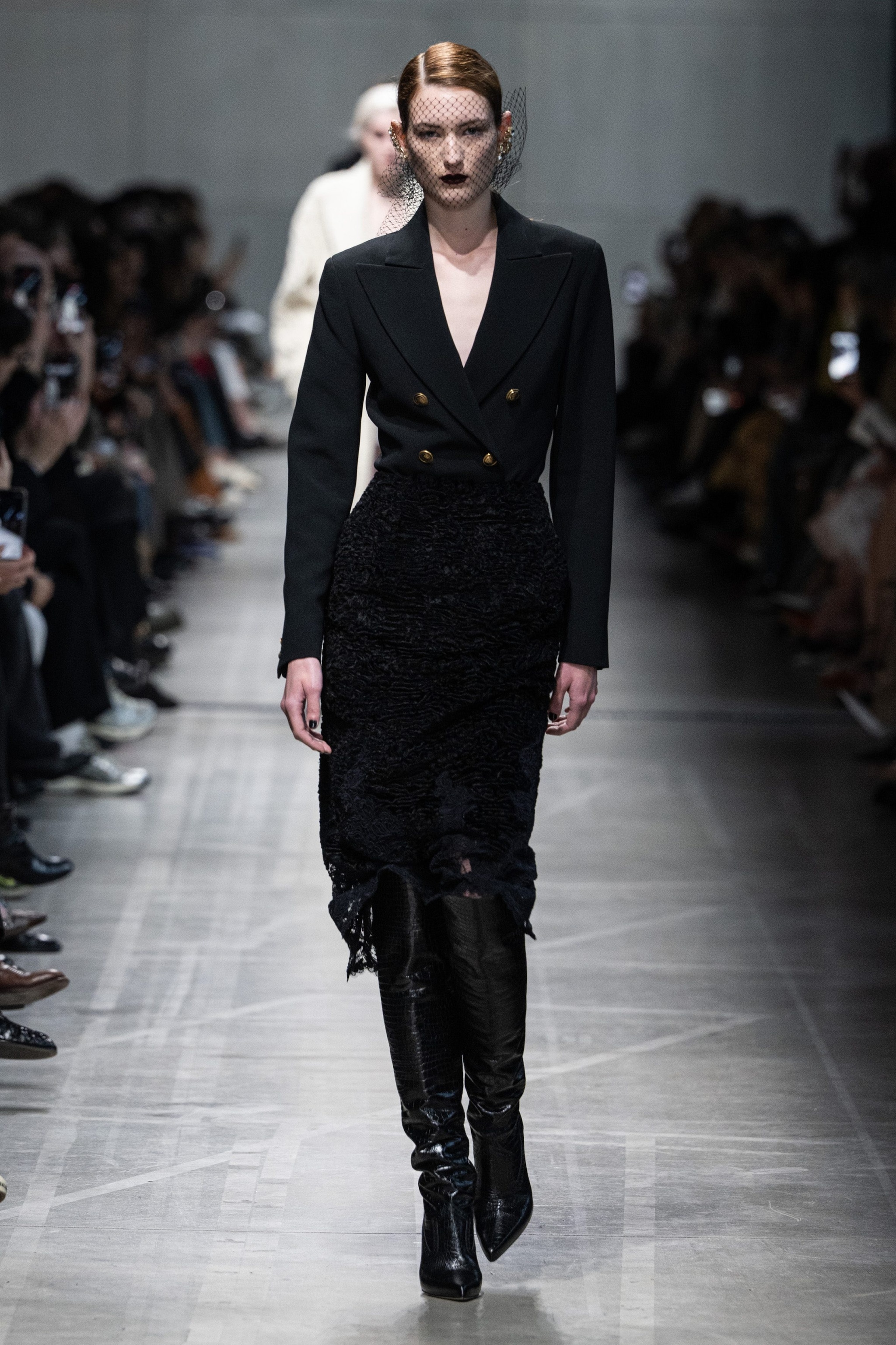 Cappotti e giacche doppio petto d'ispirazione militare, lunghi cardigan in lana e slipdress con dettagli in pizzo sfilano alla Milano Fashion Week sulla passerella Autunno/Inverno 2026-2027 di Ermanno Scervino