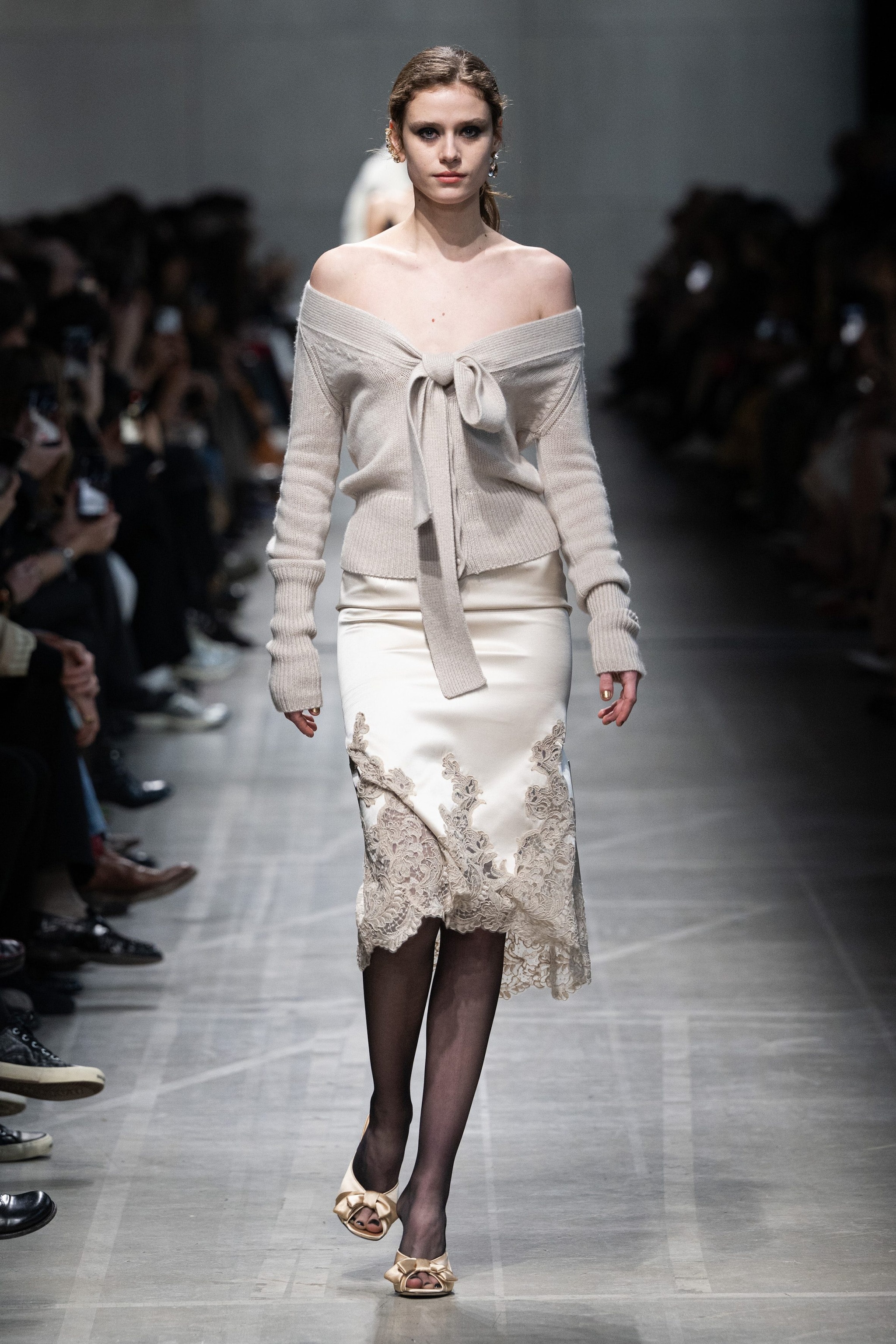 Cappotti e giacche doppio petto d'ispirazione militare, lunghi cardigan in lana e slipdress con dettagli in pizzo sfilano alla Milano Fashion Week sulla passerella Autunno/Inverno 2026-2027 di Ermanno Scervino