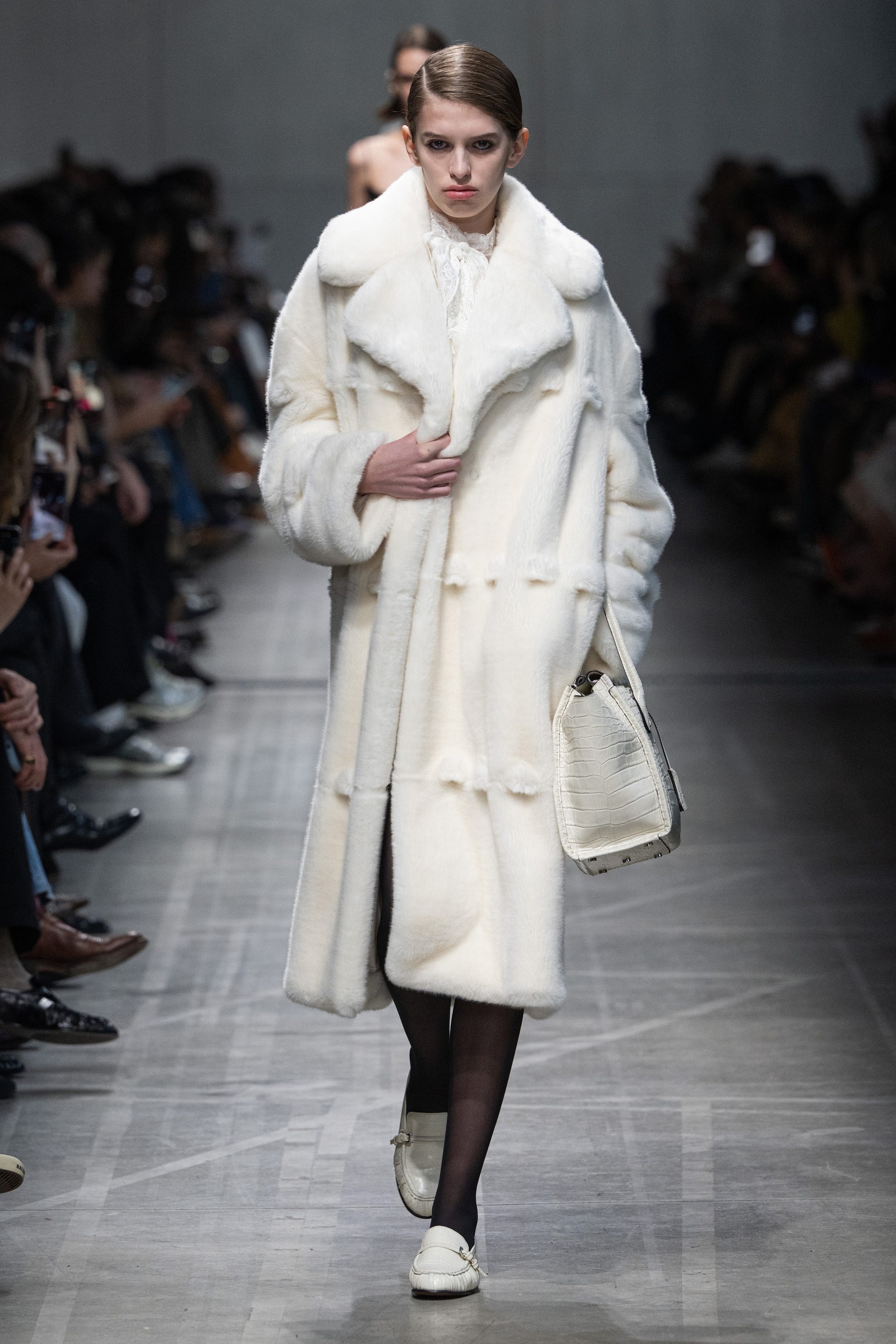 Cappotti e giacche doppio petto d'ispirazione militare, lunghi cardigan in lana e slipdress con dettagli in pizzo sfilano alla Milano Fashion Week sulla passerella Autunno/Inverno 2026-2027 di Ermanno Scervino