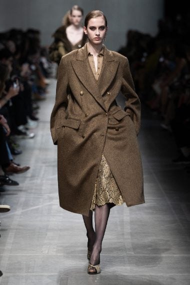 Cappotti e giacche doppio petto d'ispirazione militare, lunghi cardigan in lana e slipdress con dettagli in pizzo sfilano alla Milano Fashion Week sulla passerella Autunno/Inverno 2026-2027 di Ermanno Scervino