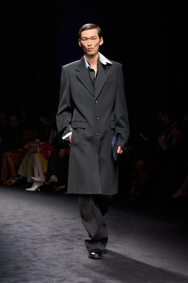 Capi de-strutturai e asimmetrici con bottoni, abiti tunica e casacche con ampi colli che simili a strascichi sfilano alla Milano Fashion Week sulla passerella Autunno/Inverno 2026-2027 di Ferragamo