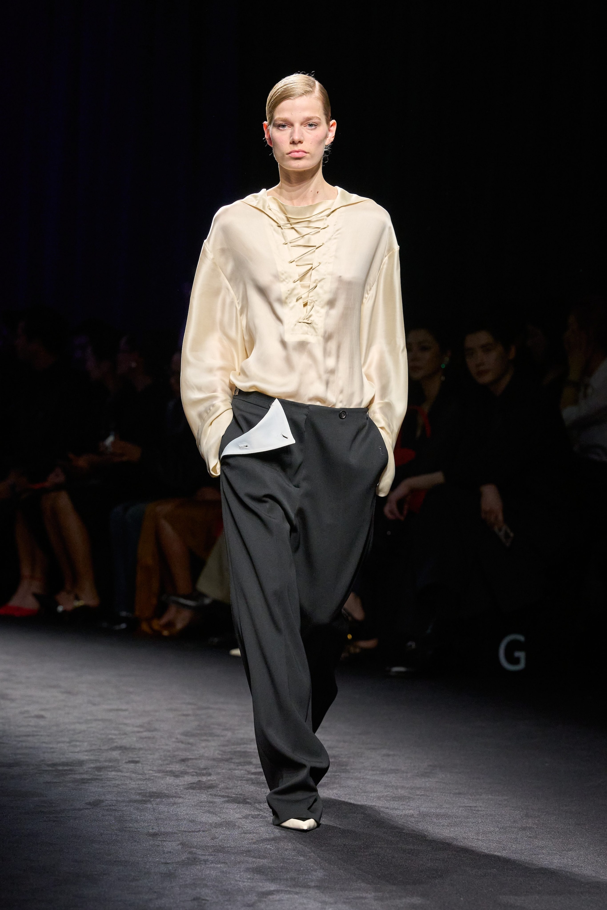 Capi de-strutturai e asimmetrici con bottoni, abiti tunica e casacche con ampi colli che simili a strascichi sfilano alla Milano Fashion Week sulla passerella Autunno/Inverno 2026-2027 di Ferragamo
