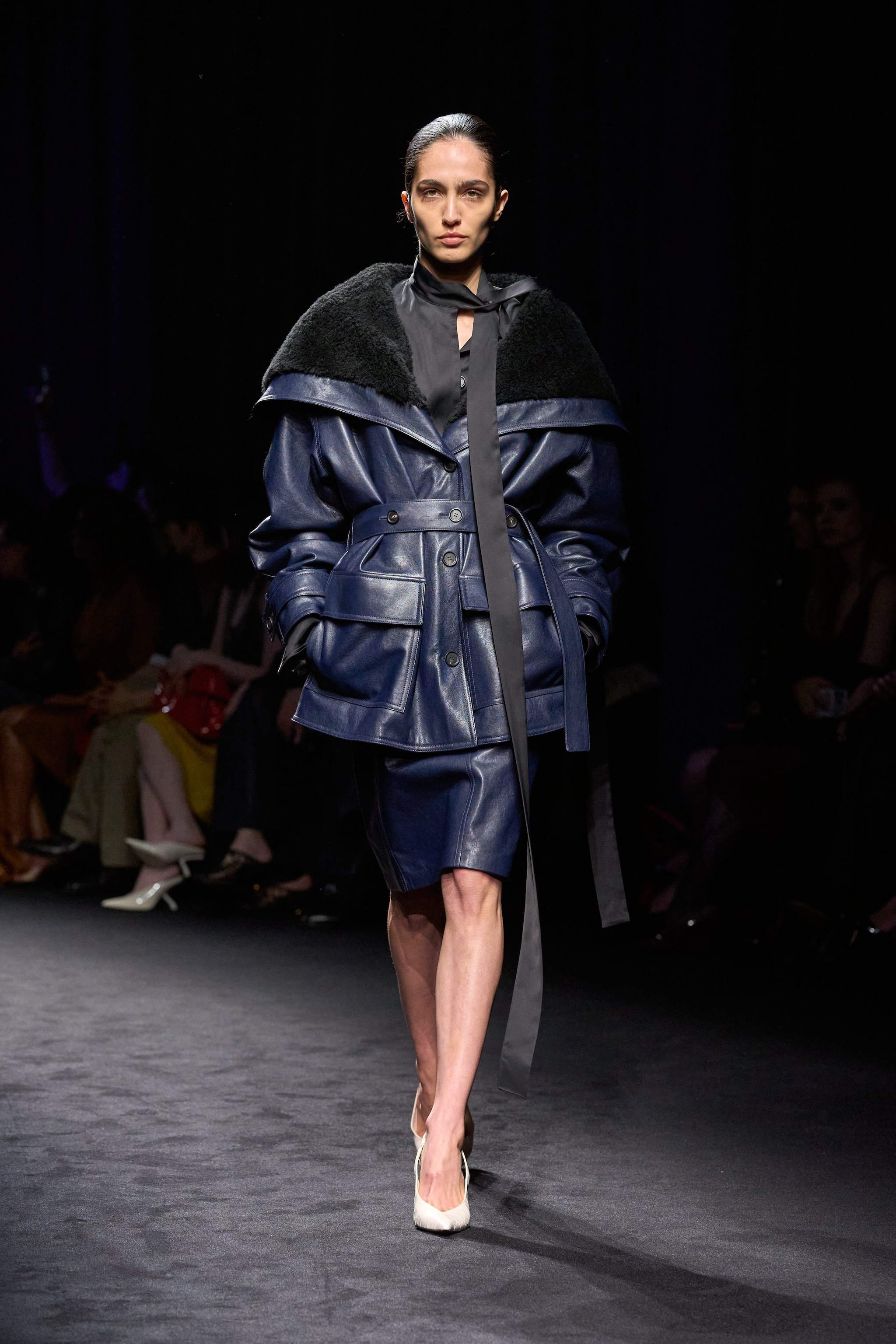 Capi de-strutturai e asimmetrici con bottoni, abiti tunica e casacche con ampi colli che simili a strascichi sfilano alla Milano Fashion Week sulla passerella Autunno/Inverno 2026-2027 di Ferragamo