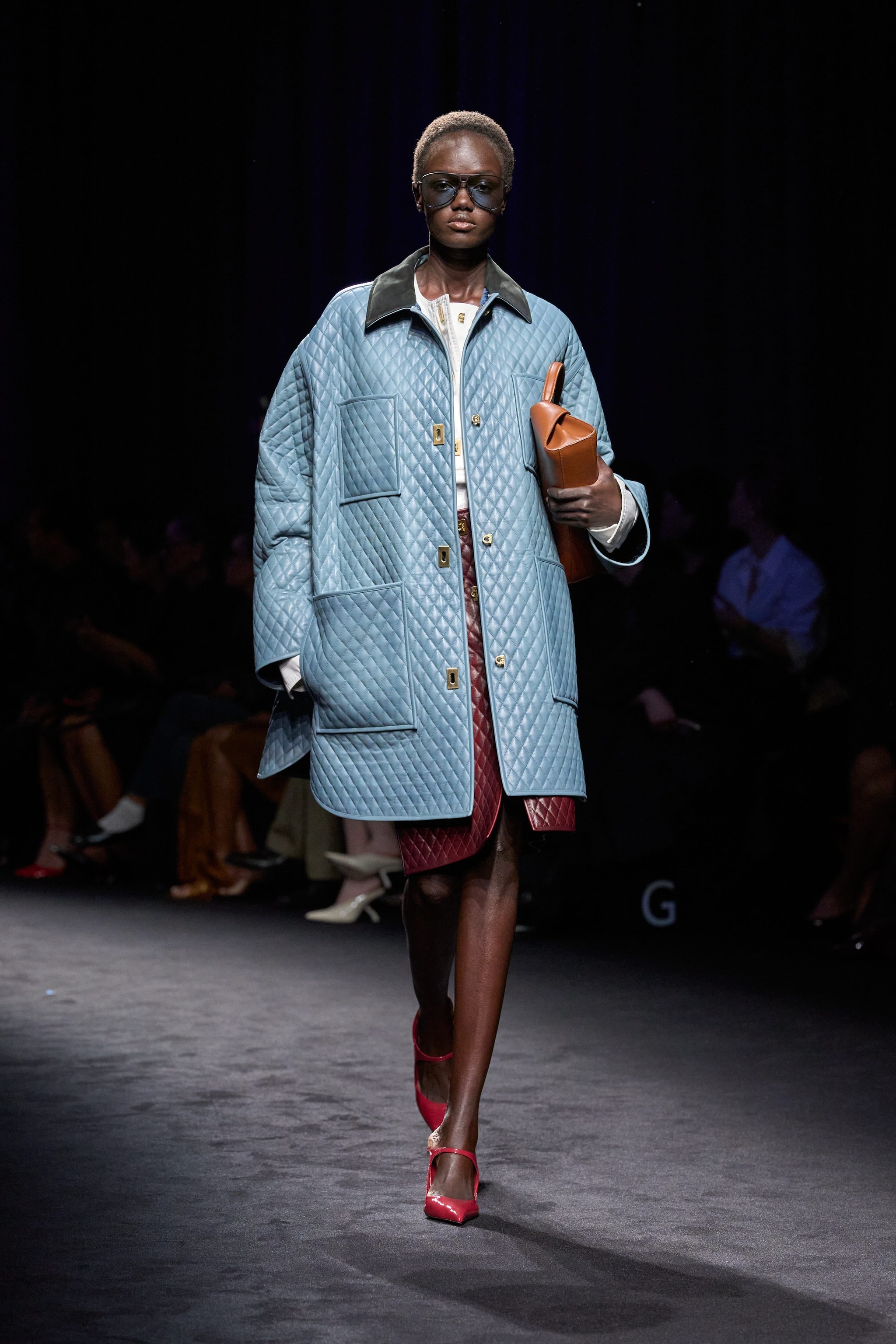 Capi de-strutturai e asimmetrici con bottoni, abiti tunica e casacche con ampi colli che simili a strascichi sfilano alla Milano Fashion Week sulla passerella Autunno/Inverno 2026-2027 di Ferragamo