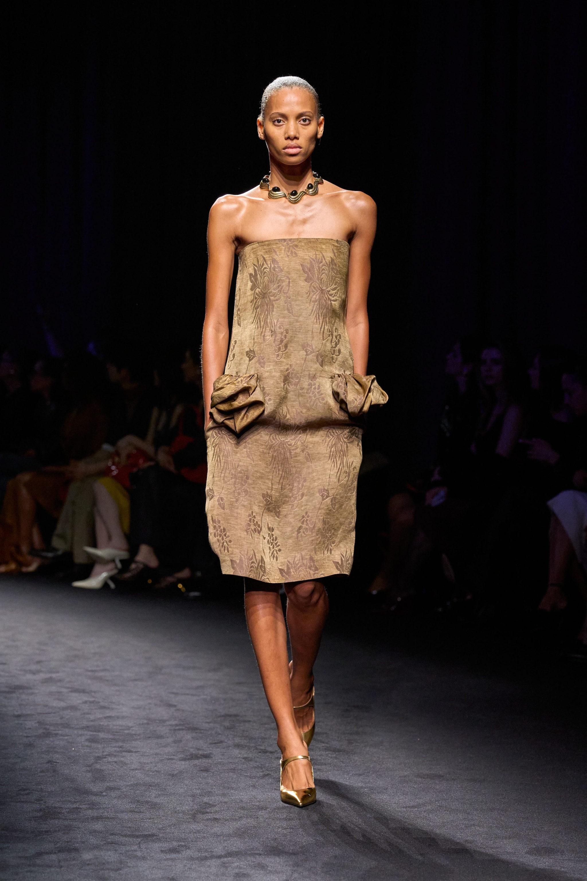 Capi de-strutturai e asimmetrici con bottoni, abiti tunica e casacche con ampi colli che simili a strascichi sfilano alla Milano Fashion Week sulla passerella Autunno/Inverno 2026-2027 di Ferragamo