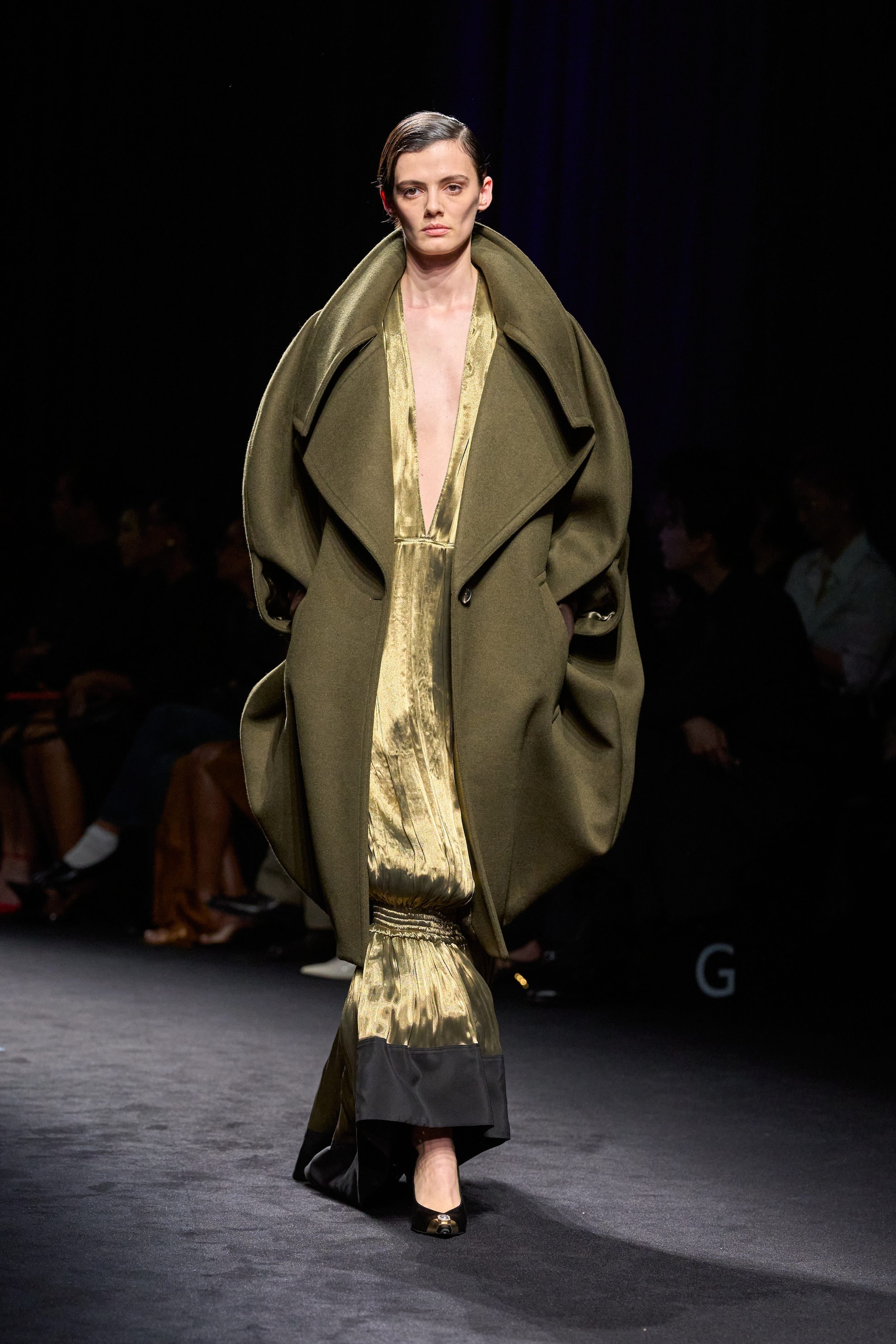 Capi de-strutturai e asimmetrici con bottoni, abiti tunica e casacche con ampi colli che simili a strascichi sfilano alla Milano Fashion Week sulla passerella Autunno/Inverno 2026-2027 di Ferragamo