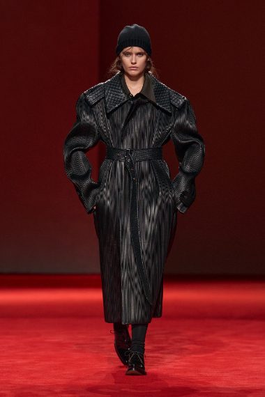 Volumetrici abiti e capospalla che sembrano pellicce, trench in pelle oversize, gonne con cinture asimmetriche e capi intrecciati sfilano alla Milano Fashion Week sulla passerella Autunno/Inverno 2026-2027 di Bottega Veneta