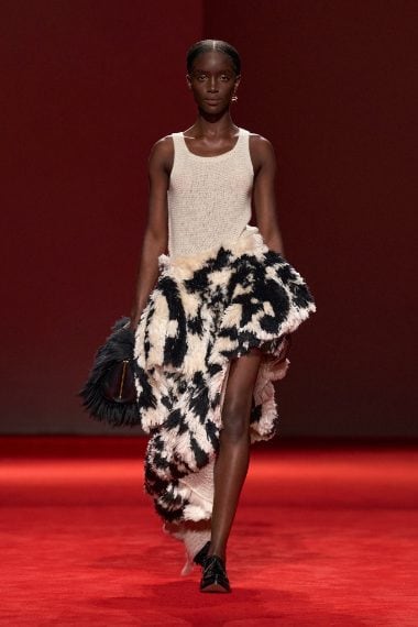 Volumetrici abiti e capospalla che sembrano pellicce, trench in pelle oversize, gonne con cinture asimmetriche e capi intrecciati sfilano alla Milano Fashion Week sulla passerella Autunno/Inverno 2026-2027 di Bottega Veneta