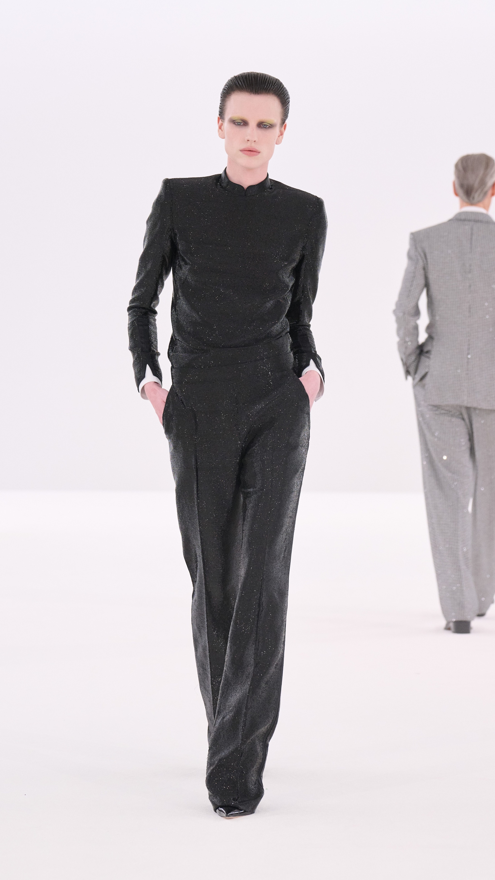 Completi in total white, caposapalla e abiti con fantasie animalier, suits gessati e linee slim sfilano alla Paris Fashion Week sulla passerella Autunno/Inverno 2026-2027 di Tom Ford