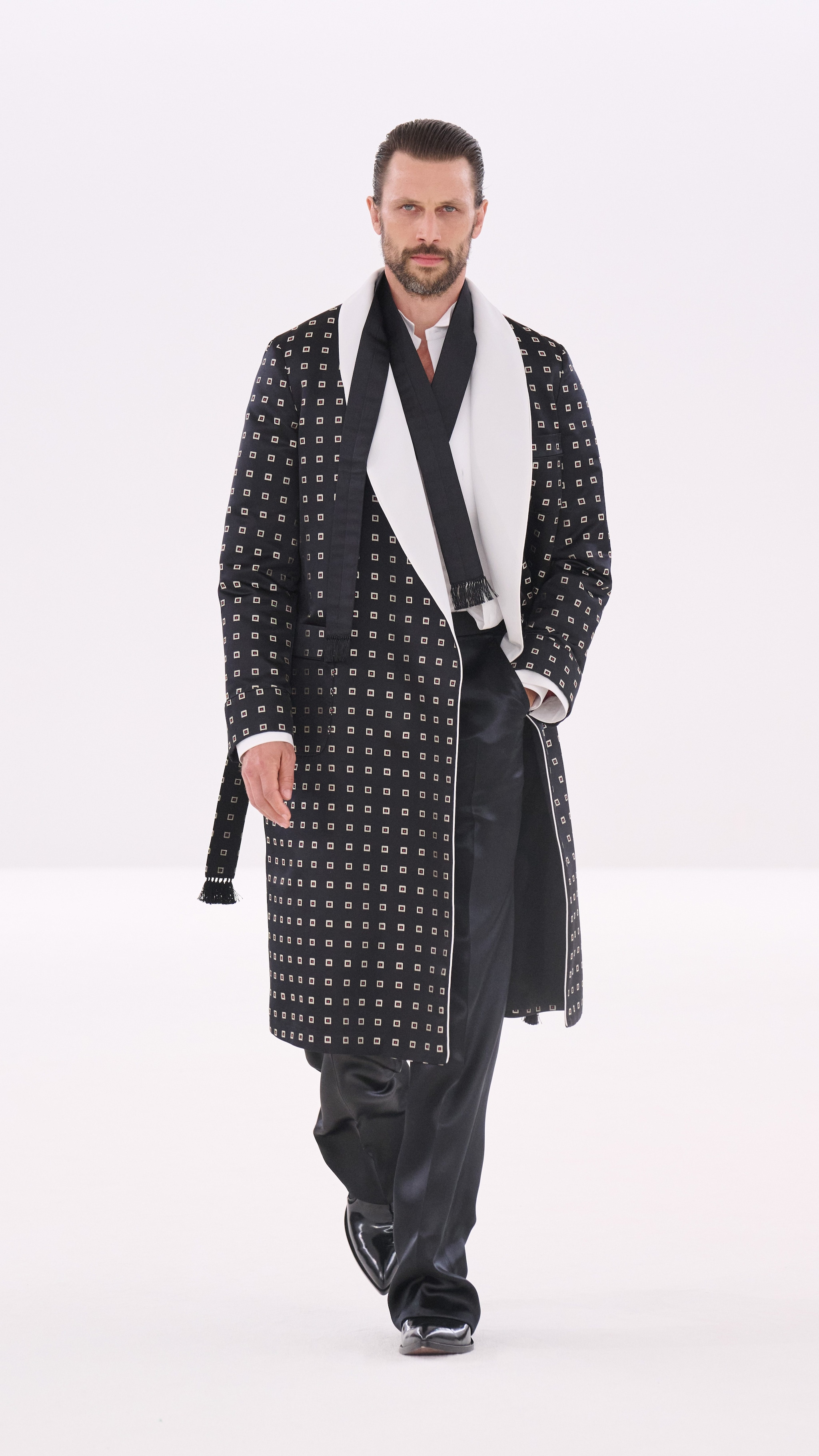 Completi in total white, caposapalla e abiti con fantasie animalier, suits gessati e linee slim sfilano alla Paris Fashion Week sulla passerella Autunno/Inverno 2026-2027 di Tom Ford