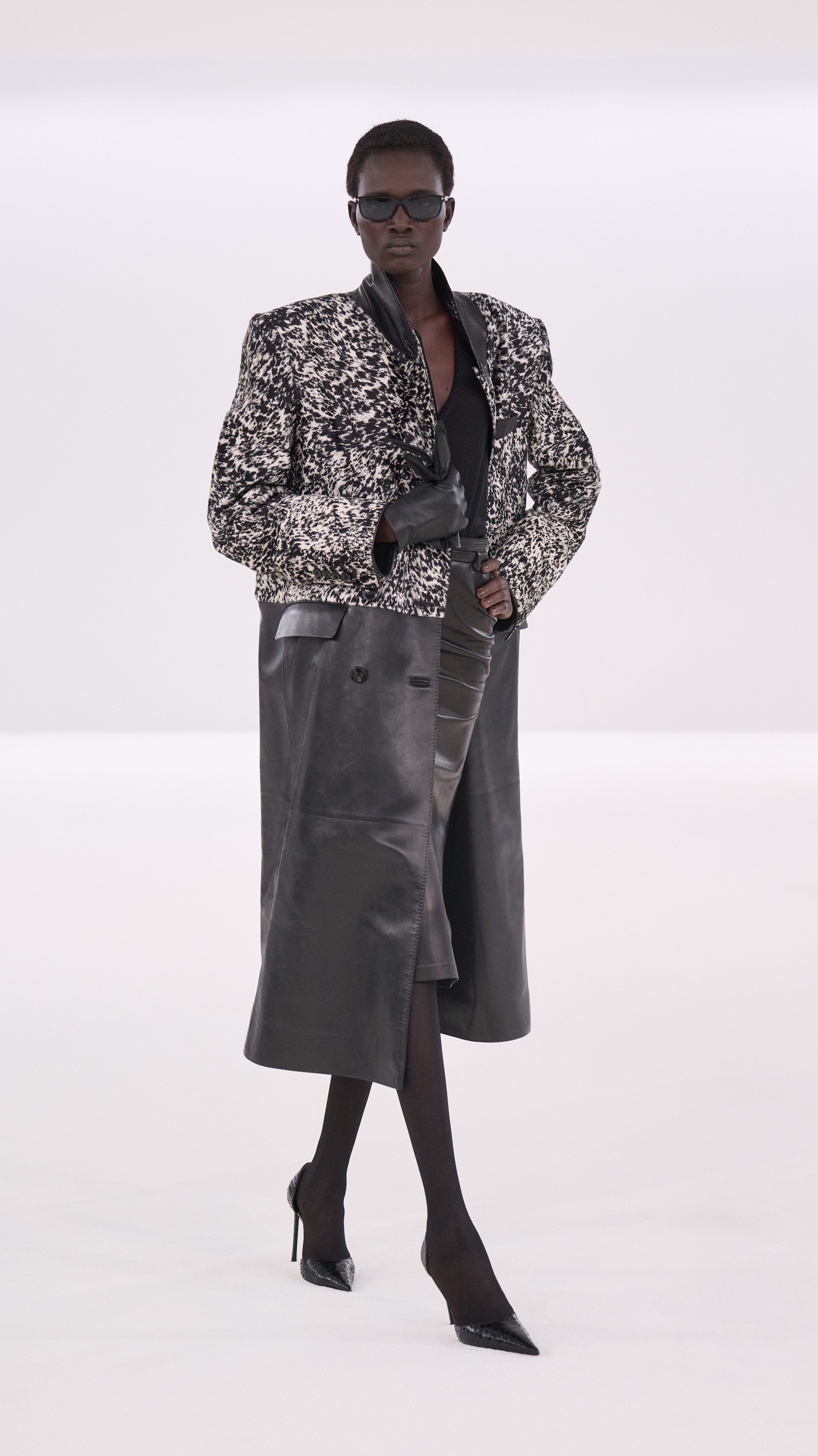 Completi in total white, caposapalla e abiti con fantasie animalier, suits gessati e linee slim sfilano alla Paris Fashion Week sulla passerella Autunno/Inverno 2026-2027 di Tom Ford