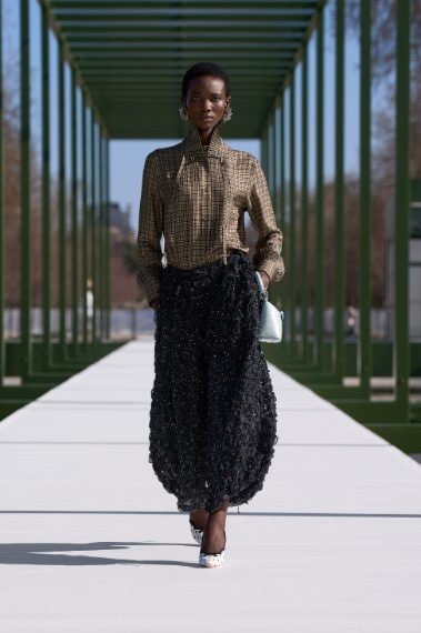 Vaporose gonne a balze con strascichi posteriori, completi in fantasia principe di Galles, jeans con decori di cristalli e completi dai sinuosi orli a onda sfilano alla Paris Fashion Week sulla passerella Autunno/Inverno 2026-2027 di Dior nella collezione firmata da Jonathan Anderson