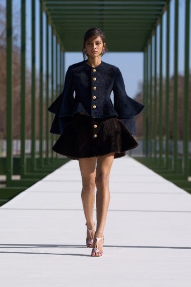 Vaporose gonne a balze con strascichi posteriori, completi in fantasia principe di Galles, jeans con decori di cristalli e completi dai sinuosi orli a onda sfilano alla Paris Fashion Week sulla passerella Autunno/Inverno 2026-2027 di Dior nella collezione firmata da Jonathan Anderson