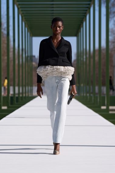 Vaporose gonne a balze con strascichi posteriori, completi in fantasia principe di Galles, jeans con decori di cristalli e completi dai sinuosi orli a onda sfilano alla Paris Fashion Week sulla passerella Autunno/Inverno 2026-2027 di Dior nella collezione firmata da Jonathan Anderson