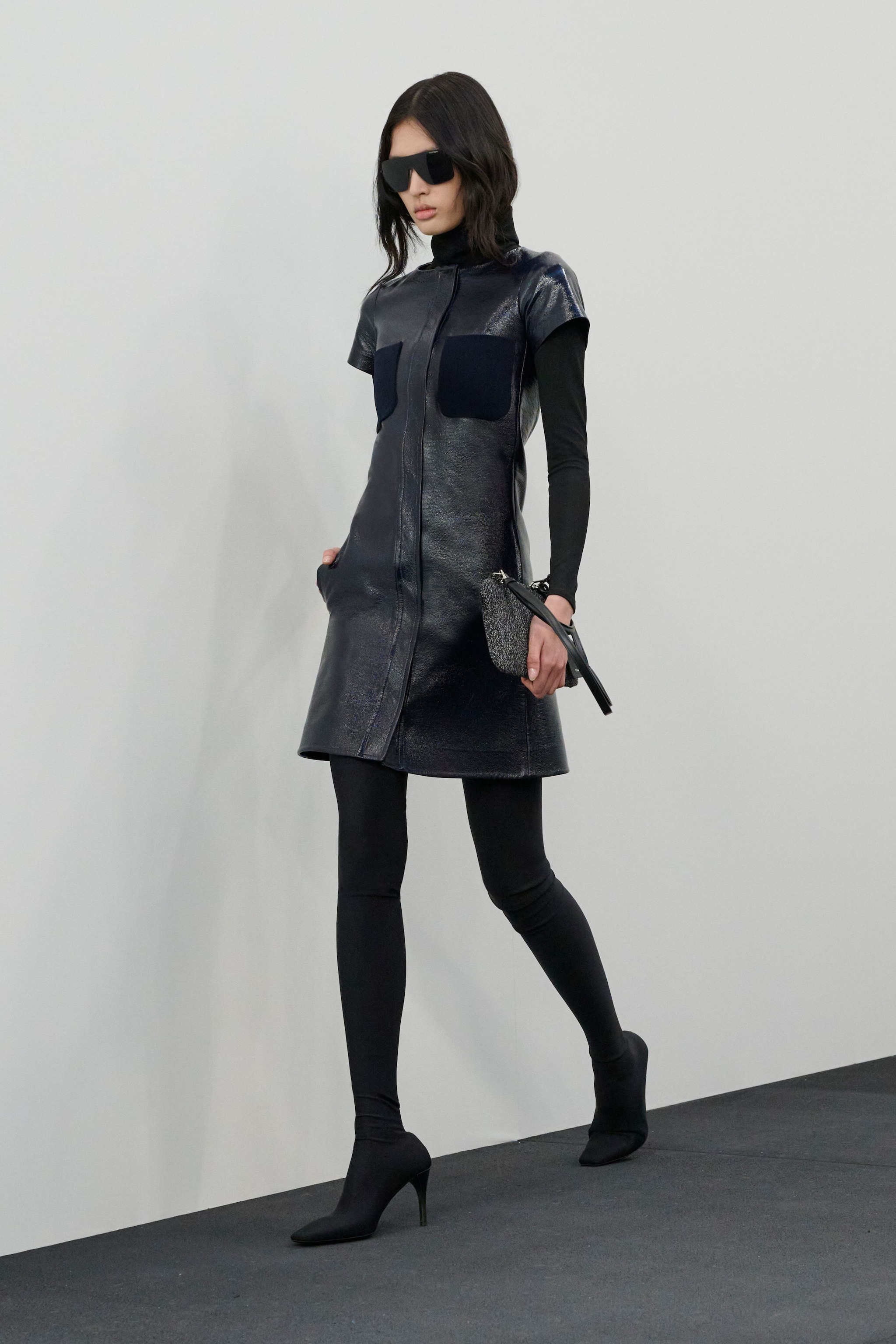 Giacche e cappotti dal collo a imbuto, mini dress in pelle e trench vernice sfilano alla Paris Fashion Week sulla passerella Autunno/Inverno 2026-2027 di Courreges