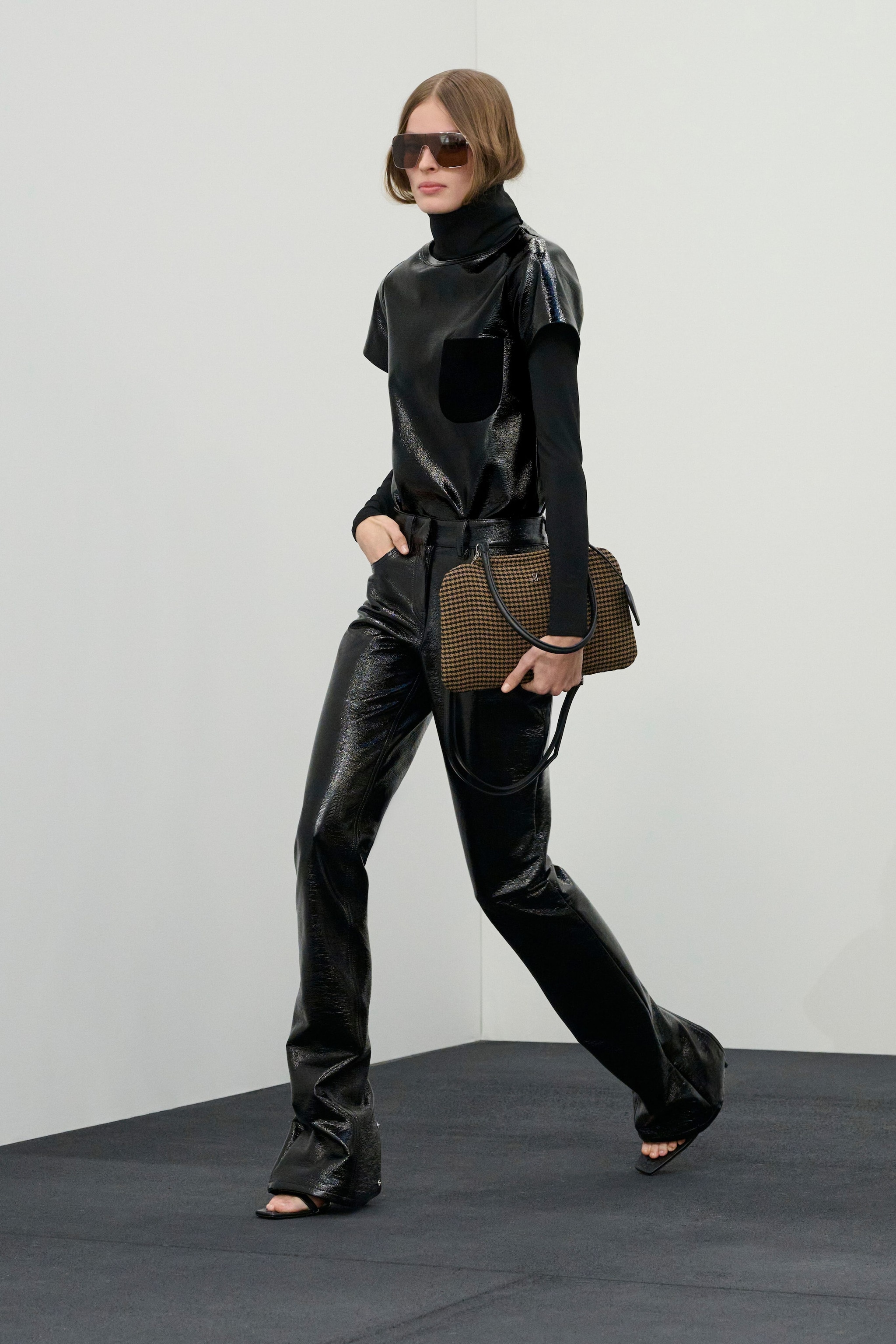 Giacche e cappotti dal collo a imbuto, mini dress in pelle e trench vernice sfilano alla Paris Fashion Week sulla passerella Autunno/Inverno 2026-2027 di Courreges