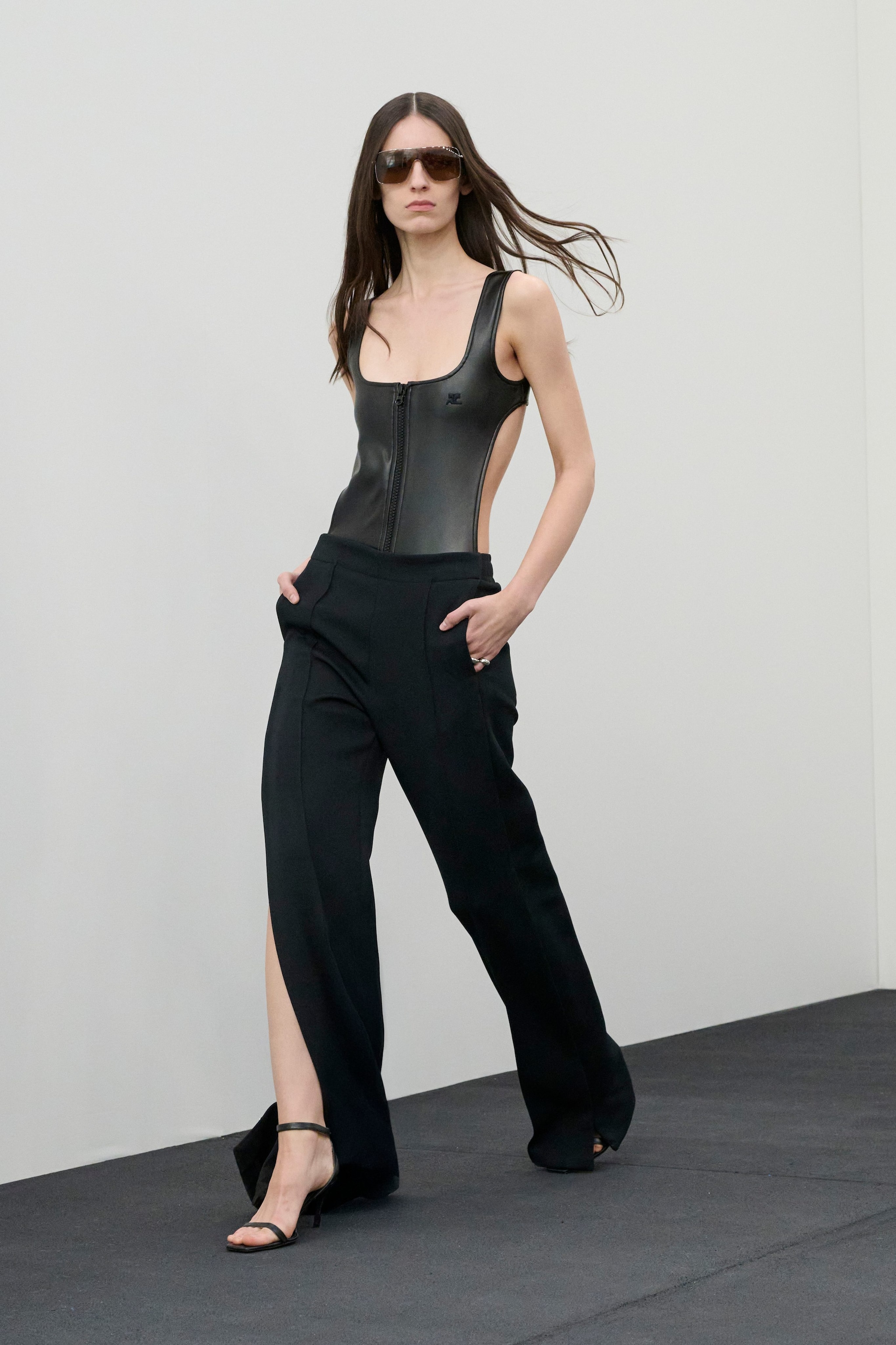 Giacche e cappotti dal collo a imbuto, mini dress in pelle e trench vernice sfilano alla Paris Fashion Week sulla passerella Autunno/Inverno 2026-2027 di Courreges