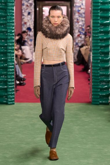 Pantaloni slim, montoni crop e capi dalle stampe check sfilano alla Paris Fashion Week sulla passerella Autunno/Inverno 2026-2027 di Acne Studios