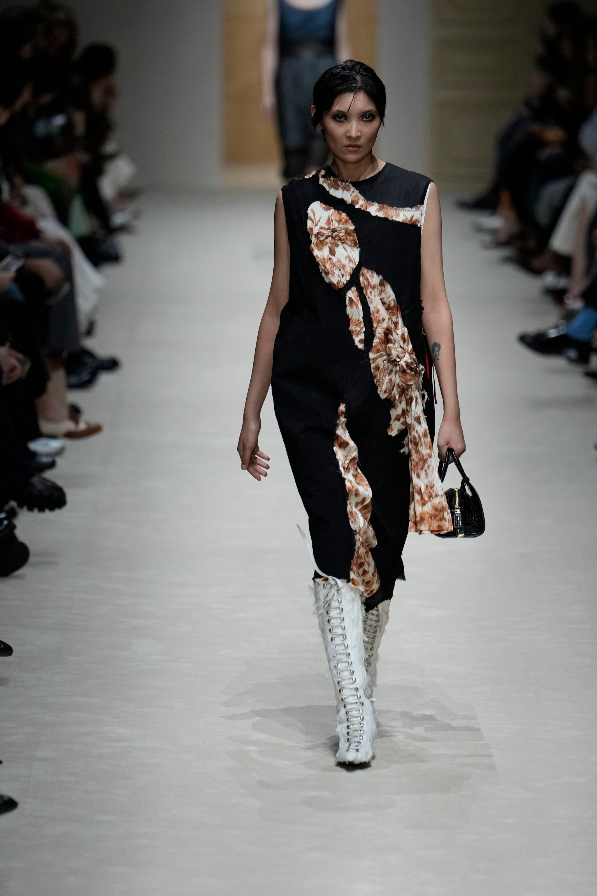 Maglioni con la zip, gonne longuette con decori di cristalli, accostamenti di colore audaci e abiti che sembrano strappati sfilano alla Milano Fashion Week sulla passerella Autunno/Inverno 2026-2027 di Prada