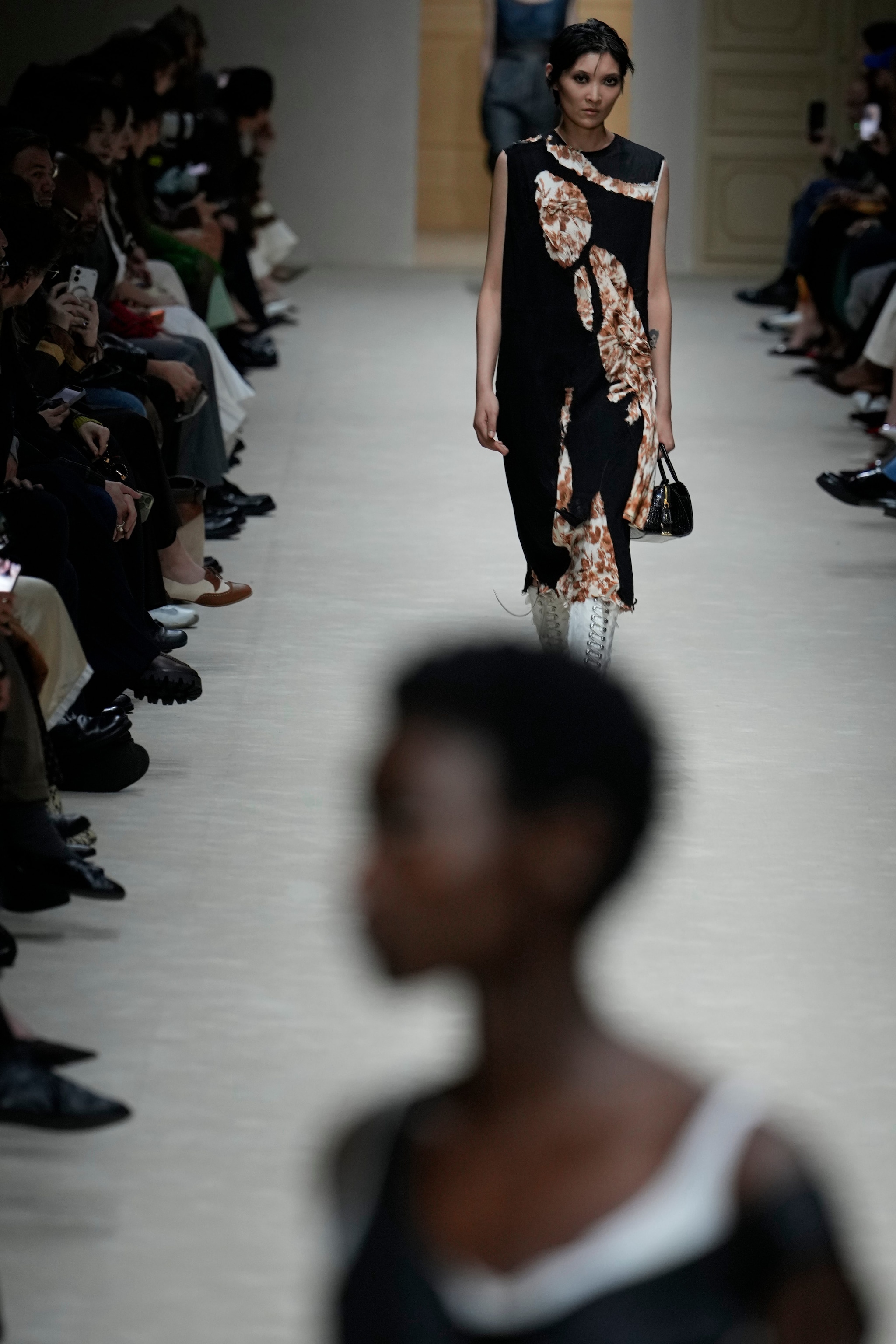 Maglioni con la zip, gonne longuette con decori di cristalli, accostamenti di colore audaci e abiti che sembrano strappati sfilano alla Milano Fashion Week sulla passerella Autunno/Inverno 2026-2027 di Prada