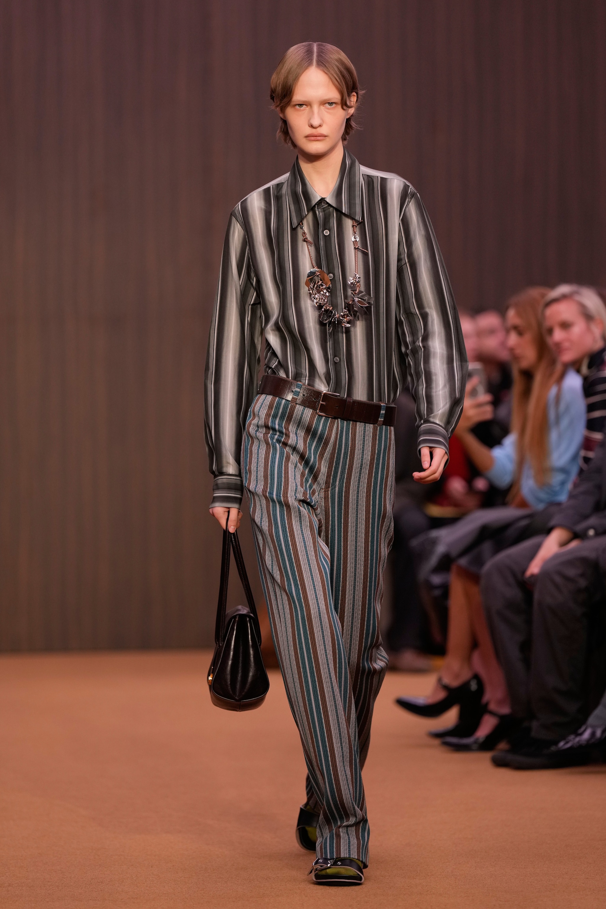 Fantasie rigate, gonne e capi in pelle, macro paillettes e stampe animalier sfilano alla Milano Fashion Week sulla passerella Autunno/Inverno 2026-2027 di Marni