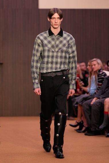 Fantasie rigate, gonne e capi in pelle, macro paillettes e stampe animalier sfilano alla Milano Fashion Week sulla passerella Autunno/Inverno 2026-2027 di Marni
