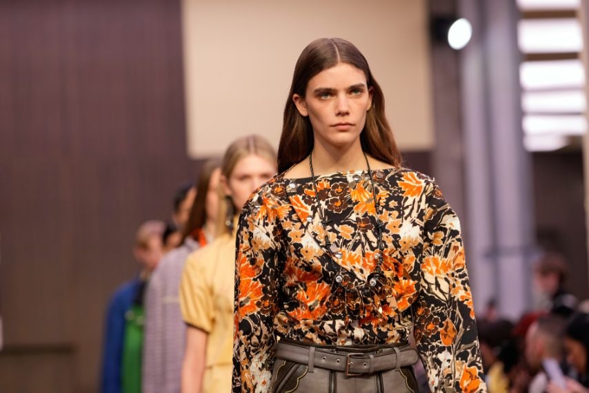 Fantasie rigate, gonne e capi in pelle, macro paillettes e stampe animalier sfilano alla Milano Fashion Week sulla passerella Autunno/Inverno 2026-2027 di Marni