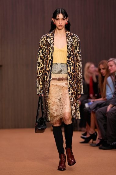 Fantasie rigate, gonne e capi in pelle, macro paillettes e stampe animalier sfilano alla Milano Fashion Week sulla passerella Autunno/Inverno 2026-2027 di Marni