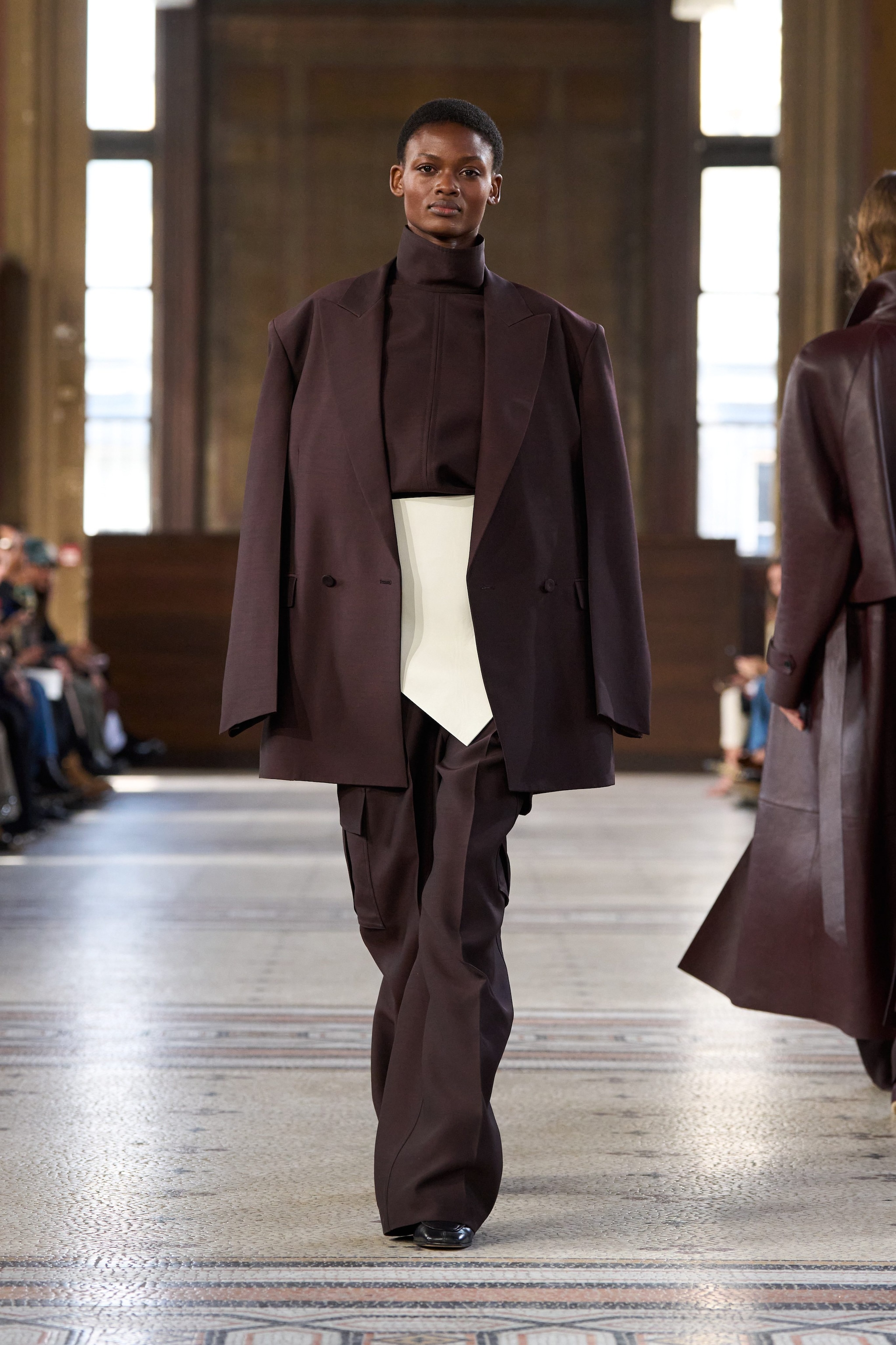 Bluse con maxi spalle tonde, inserti spigolosi nei look, outfit in total brown, bomber e abiti con le frange sfilano alla Paris Fashion Week sulla passerella Autunno/Inverno 2026-2027 di Carven