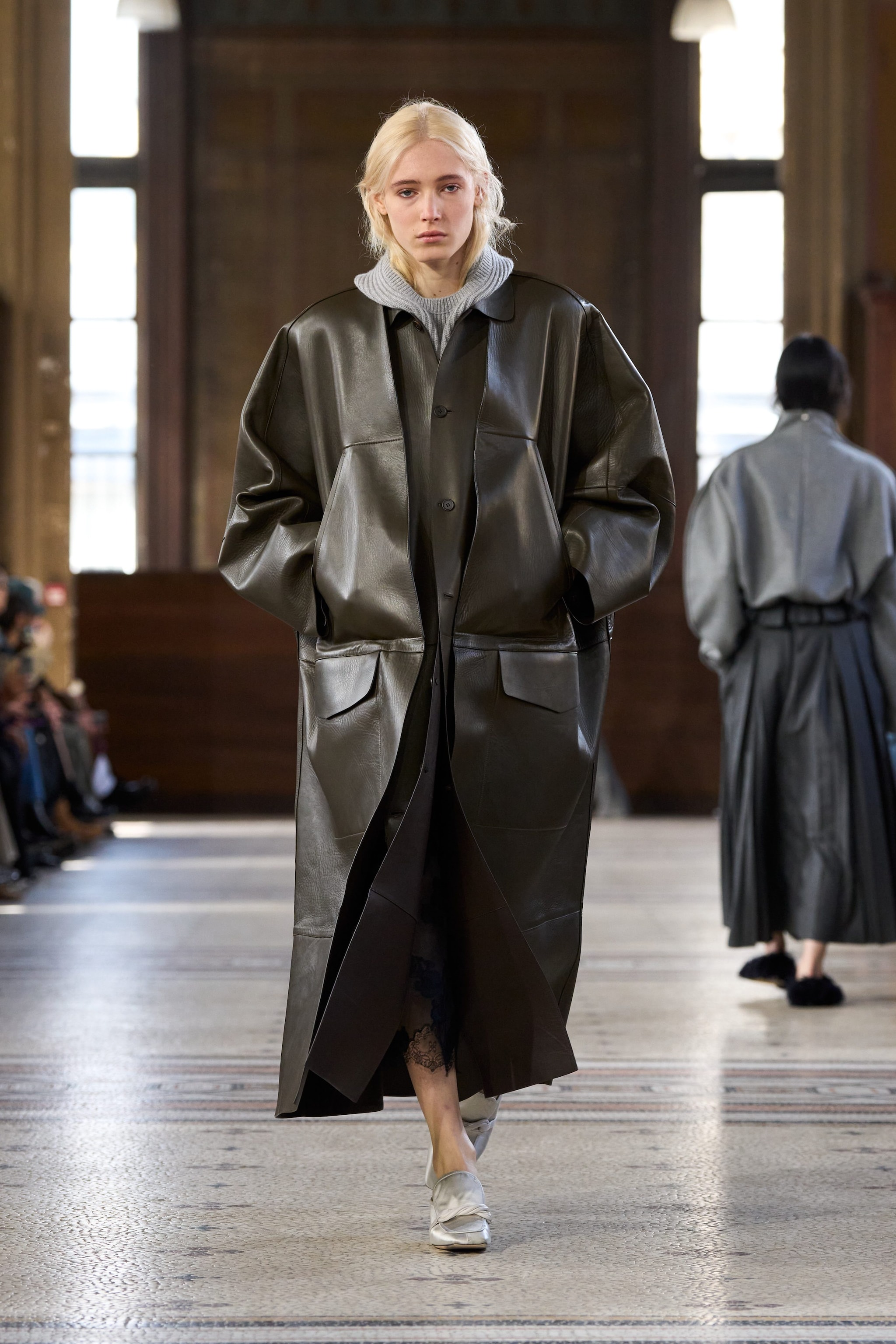 Bluse con maxi spalle tonde, inserti spigolosi nei look, outfit in total brown, bomber e abiti con le frange sfilano alla Paris Fashion Week sulla passerella Autunno/Inverno 2026-2027 di Carven
