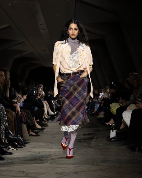 Capi check mescolati con abiti dalle fantasie floreali, look in layering composti a strati, decori lucenti e bomber in pelliccia eco sfilano alla Paris Fashion Week sulla passerella Autunno/Inverno 2026-2027 di Rabanne