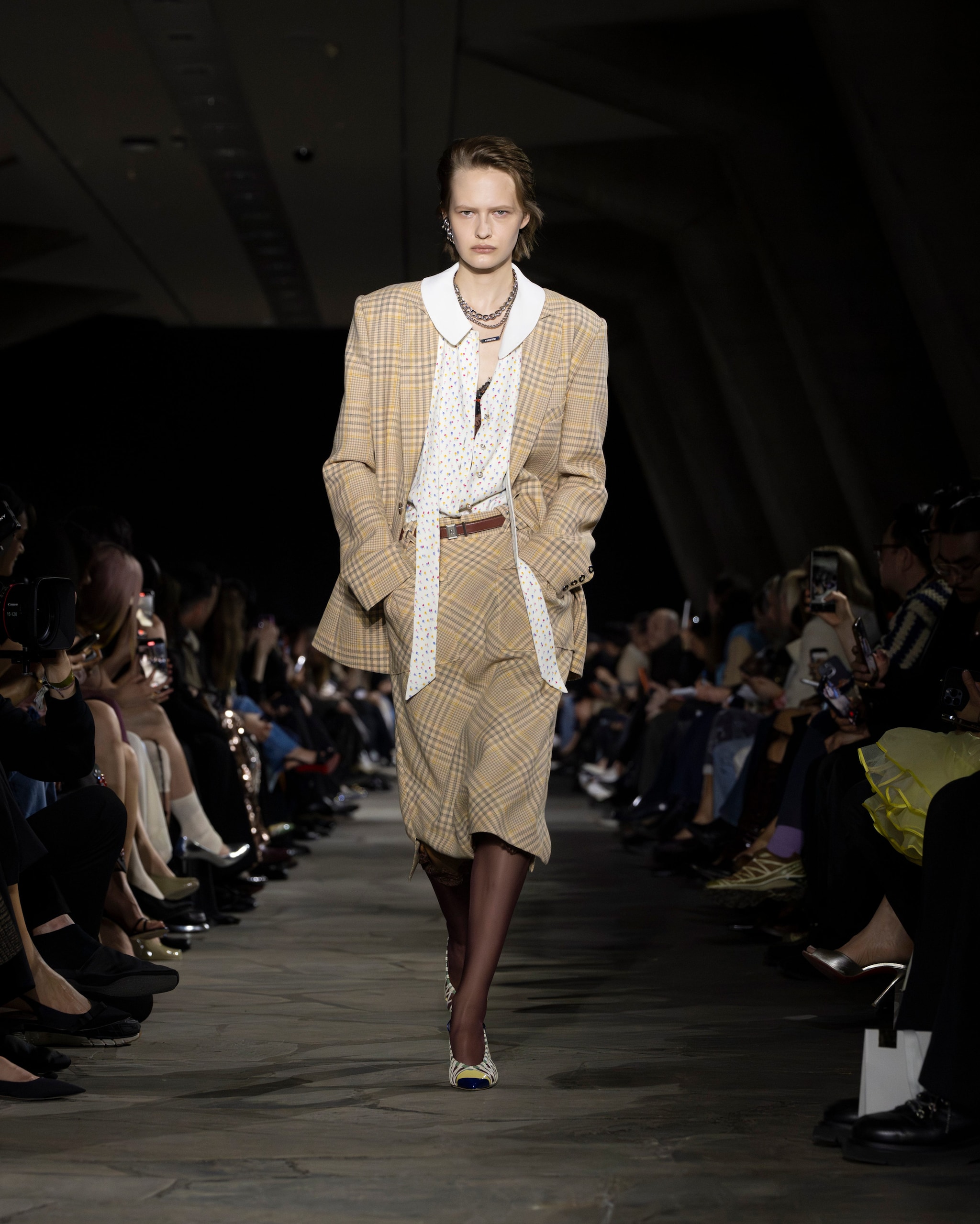 Capi check mescolati con abiti dalle fantasie floreali, look in layering composti a strati, decori lucenti e bomber in pelliccia eco sfilano alla Paris Fashion Week sulla passerella Autunno/Inverno 2026-2027 di Rabanne