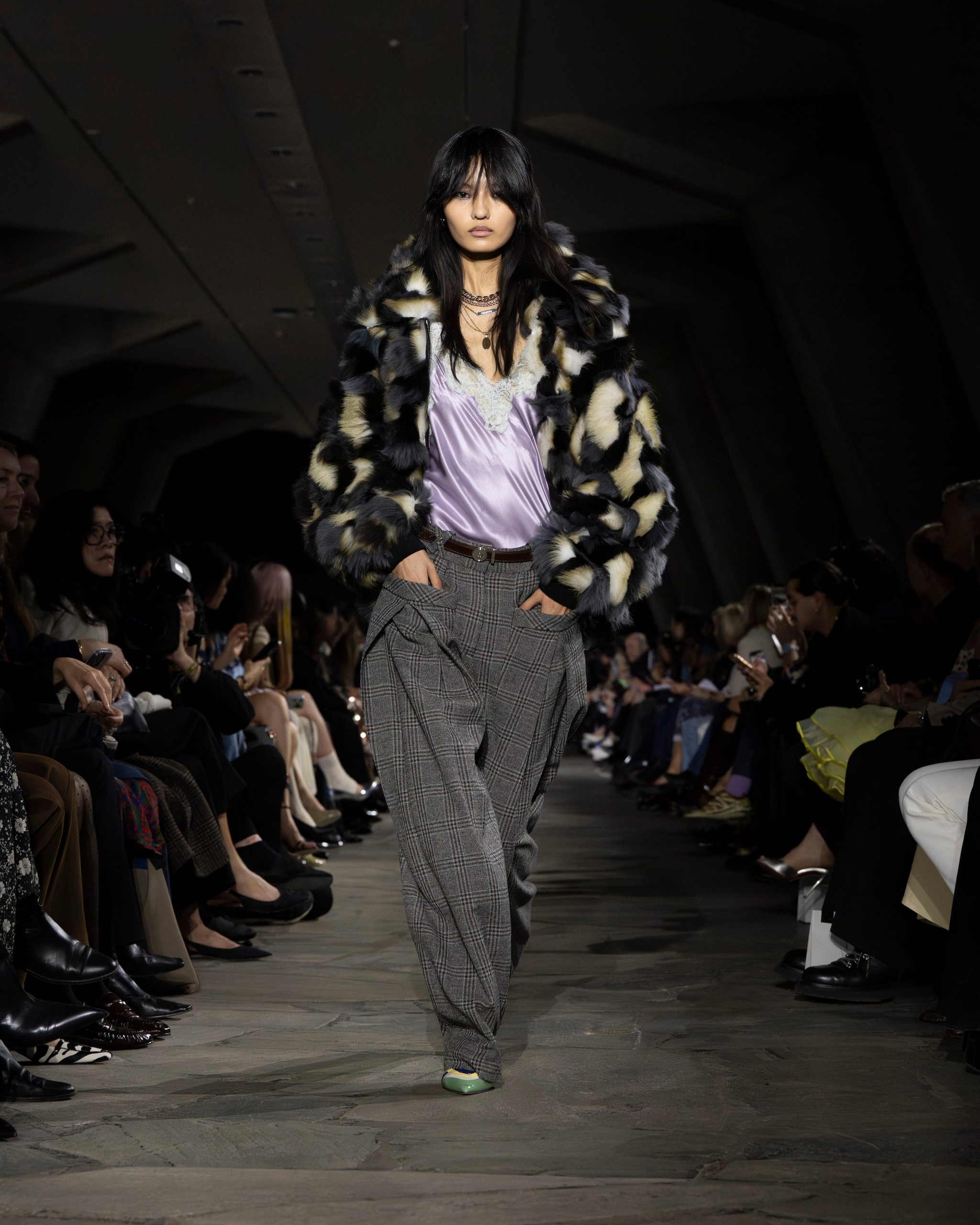 Capi check mescolati con abiti dalle fantasie floreali, look in layering composti a strati, decori lucenti e bomber in pelliccia eco sfilano alla Paris Fashion Week sulla passerella Autunno/Inverno 2026-2027 di Rabanne