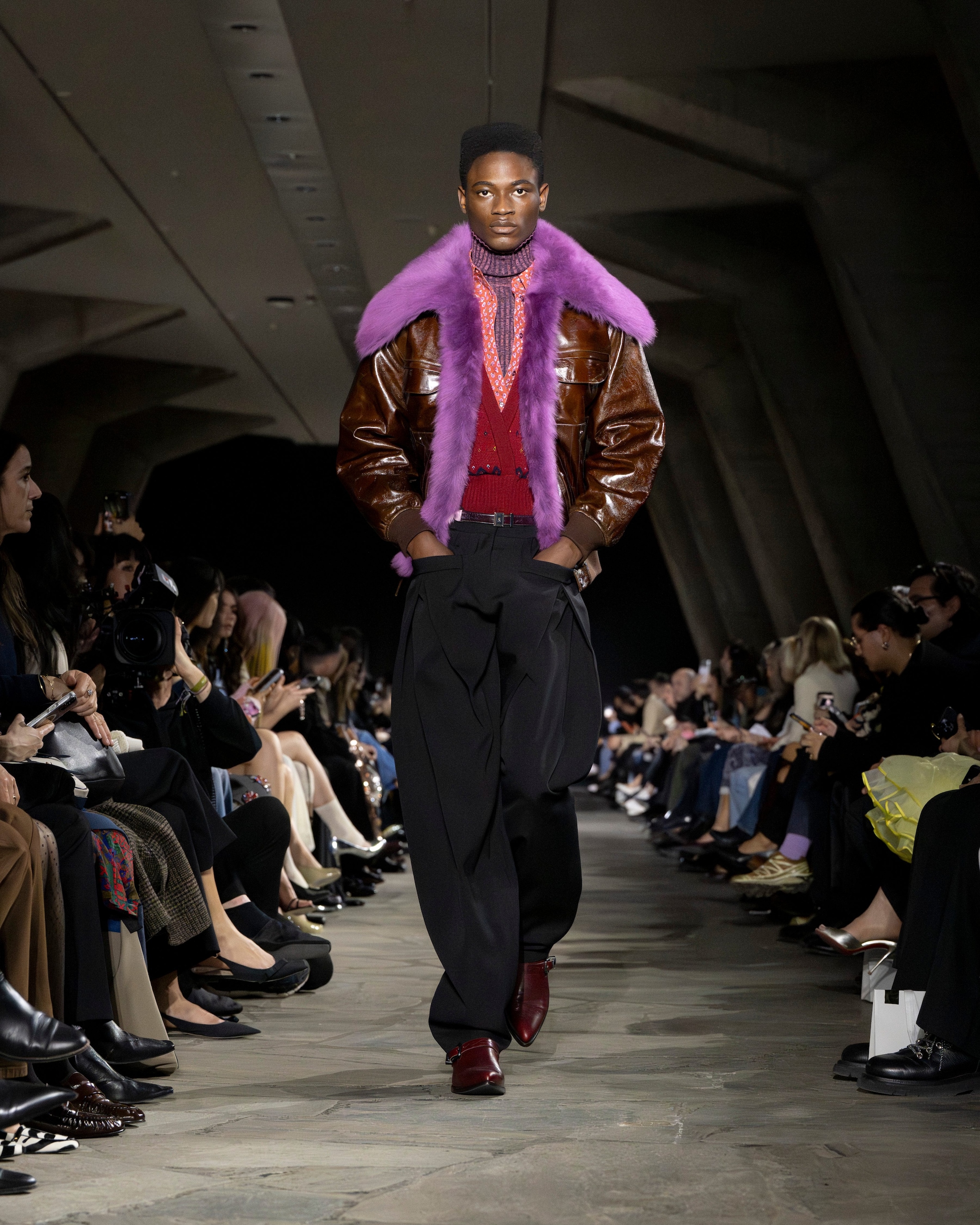 Capi check mescolati con abiti dalle fantasie floreali, look in layering composti a strati, decori lucenti e bomber in pelliccia eco sfilano alla Paris Fashion Week sulla passerella Autunno/Inverno 2026-2027 di Rabanne