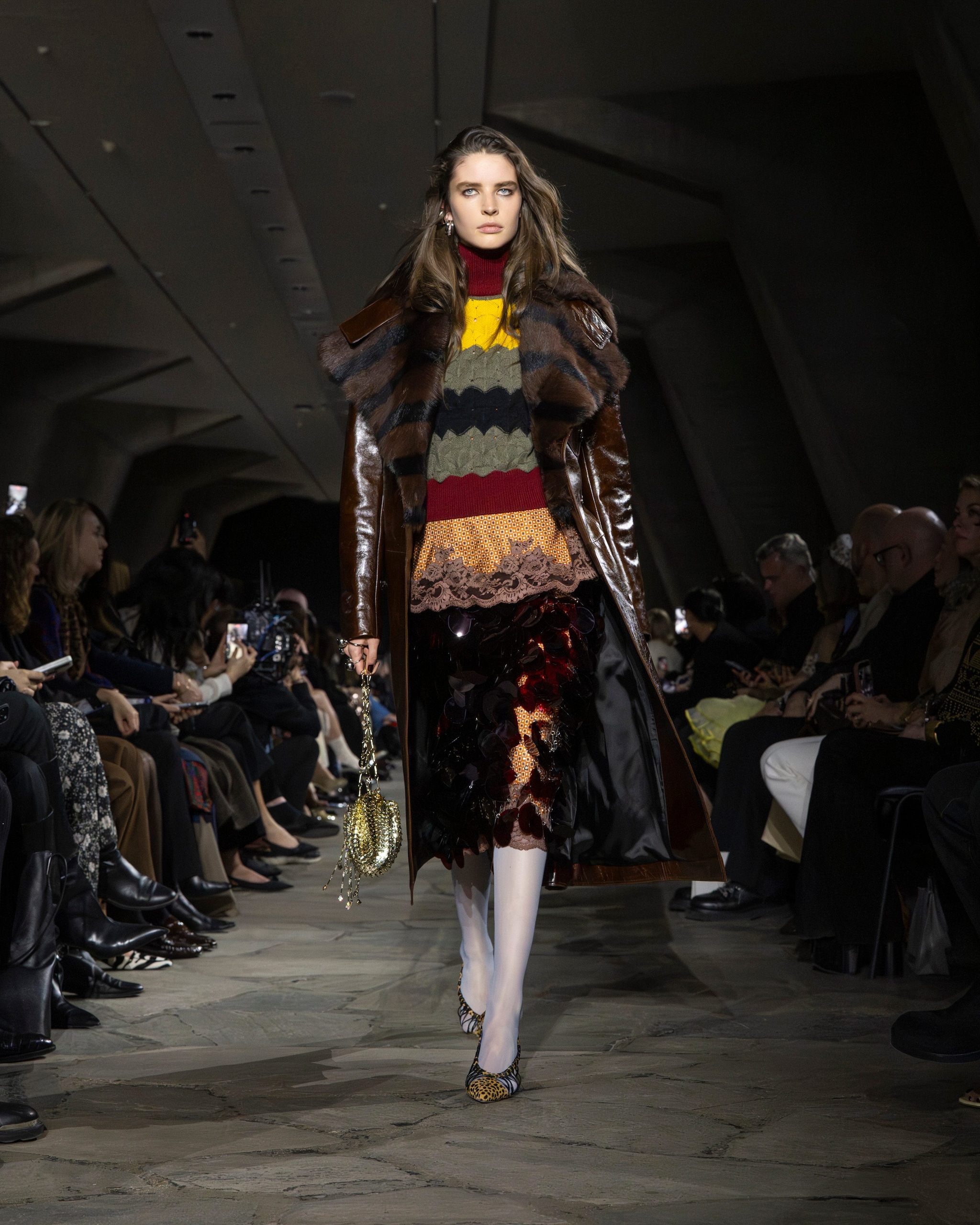 Capi check mescolati con abiti dalle fantasie floreali, look in layering composti a strati, decori lucenti e bomber in pelliccia eco sfilano alla Paris Fashion Week sulla passerella Autunno/Inverno 2026-2027 di Rabanne
