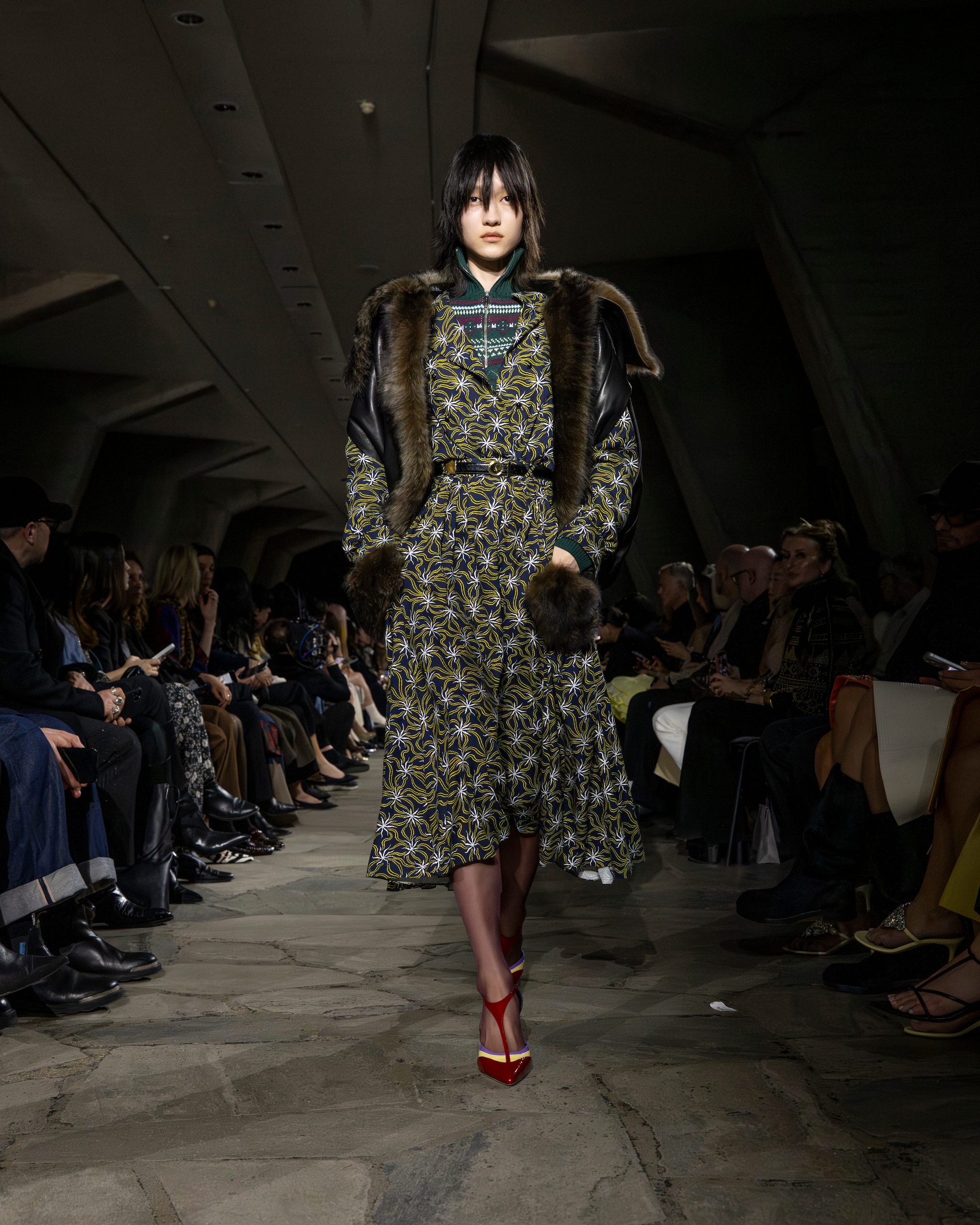 Capi check mescolati con abiti dalle fantasie floreali, look in layering composti a strati, decori lucenti e bomber in pelliccia eco sfilano alla Paris Fashion Week sulla passerella Autunno/Inverno 2026-2027 di Rabanne