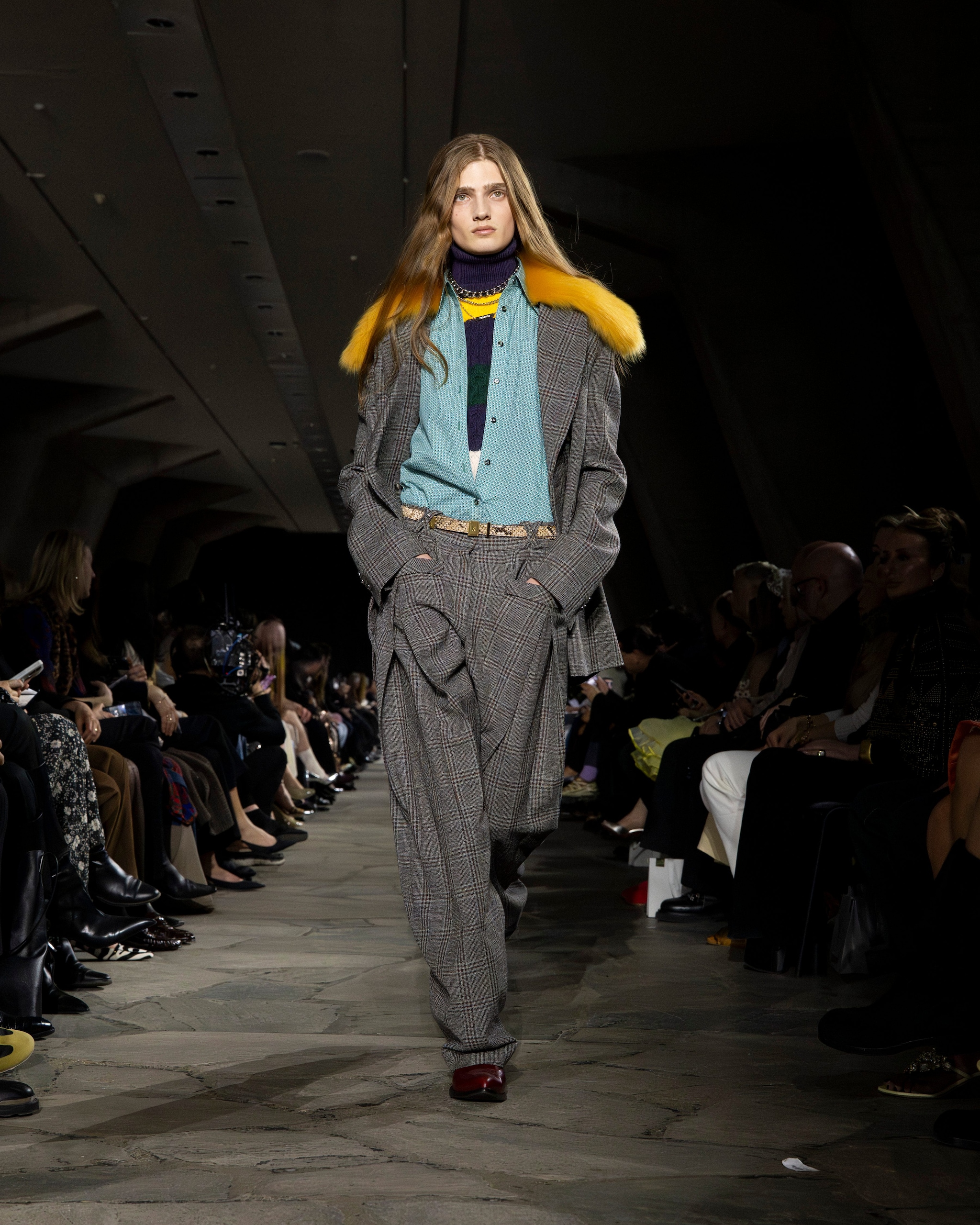 Capi check mescolati con abiti dalle fantasie floreali, look in layering composti a strati, decori lucenti e bomber in pelliccia eco sfilano alla Paris Fashion Week sulla passerella Autunno/Inverno 2026-2027 di Rabanne
