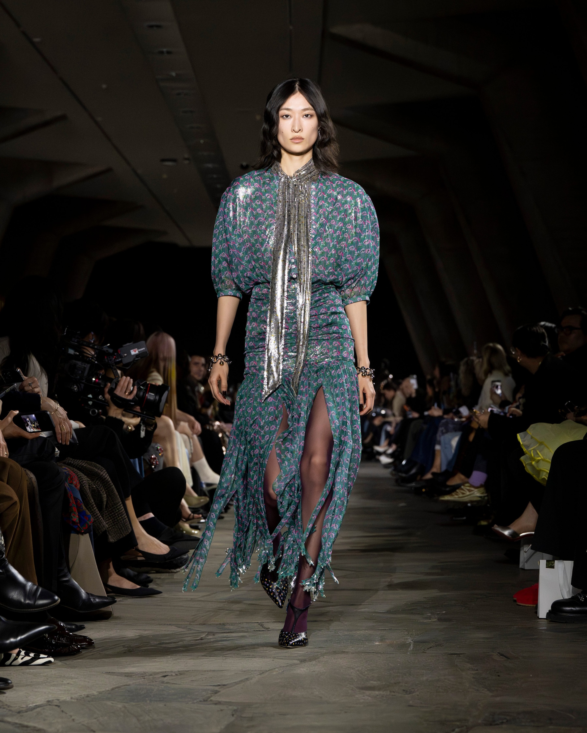 Capi check mescolati con abiti dalle fantasie floreali, look in layering composti a strati, decori lucenti e bomber in pelliccia eco sfilano alla Paris Fashion Week sulla passerella Autunno/Inverno 2026-2027 di Rabanne