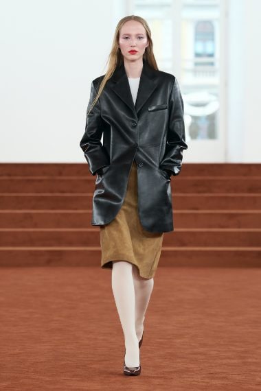 Cappotti e gonne con drappeggi che assomigliano a petali, look monocolore alternati a capi animalier o jacquard e abiti minimali sfilano alla Milano Fashion Week sulla passerella Autunno/Inverno 2026-2027 di Jil Sander