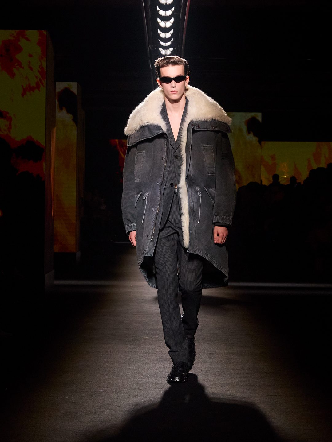 Abiti drappeggiati e cappotti con volumetrici colli scultorei e ancora felpe che diventano mini abiti e vestiti o bomber in pelle nera sfilano alla Paris Fashion Week sulla passerella Autunno/Inverno 2026-2027 di Balenciaga.