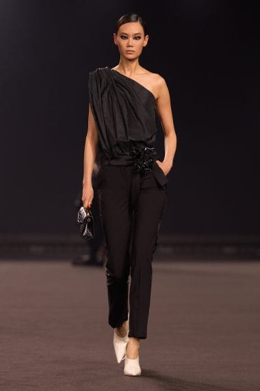 Una palette dominata da nero e marrone, capi in pelle a effetto cocco, decori in pizzo, drappeggi e tagli asimmetrici sfilano alla Paris Fashion Week sulla passerella Autunno/Inverno 2026-2027 di Elie Saab
