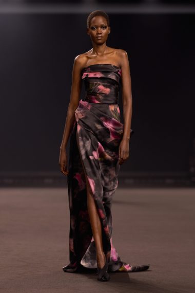 Una palette dominata da nero e marrone, capi in pelle a effetto cocco, decori in pizzo, drappeggi e tagli asimmetrici sfilano alla Paris Fashion Week sulla passerella Autunno/Inverno 2026-2027 di Elie Saab