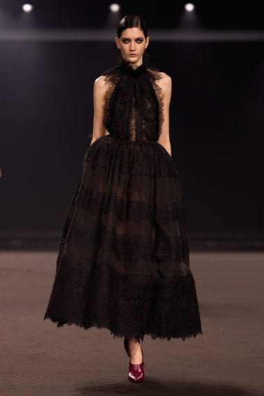 Una palette dominata da nero e marrone, capi in pelle a effetto cocco, decori in pizzo, drappeggi e tagli asimmetrici sfilano alla Paris Fashion Week sulla passerella Autunno/Inverno 2026-2027 di Elie Saab