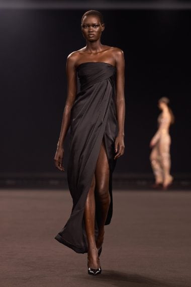 Una palette dominata da nero e marrone, capi in pelle a effetto cocco, decori in pizzo, drappeggi e tagli asimmetrici sfilano alla Paris Fashion Week sulla passerella Autunno/Inverno 2026-2027 di Elie Saab