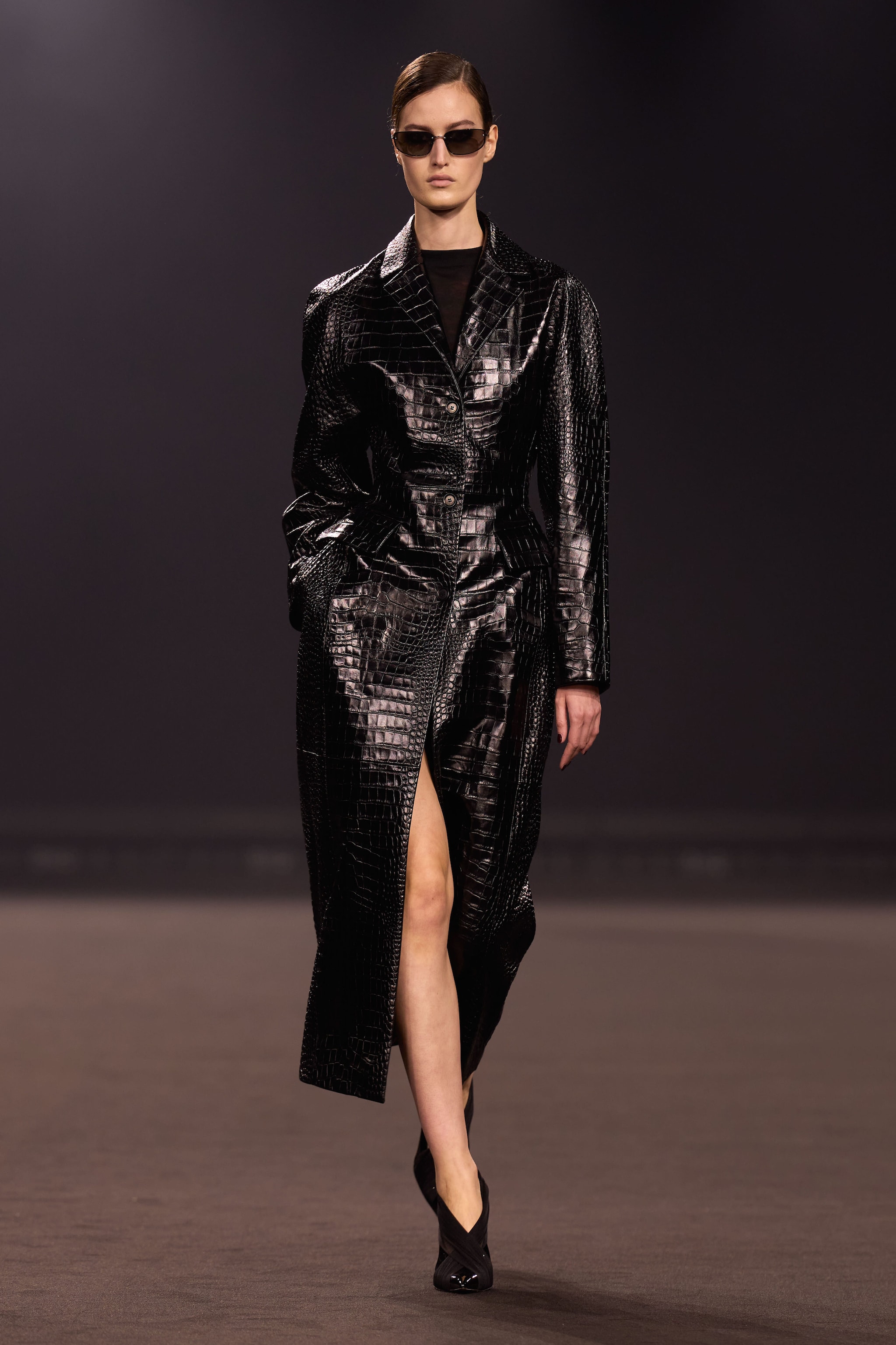 Una palette dominata da nero e marrone, capi in pelle a effetto cocco, decori in pizzo, drappeggi e tagli asimmetrici sfilano alla Paris Fashion Week sulla passerella Autunno/Inverno 2026-2027 di Elie Saab