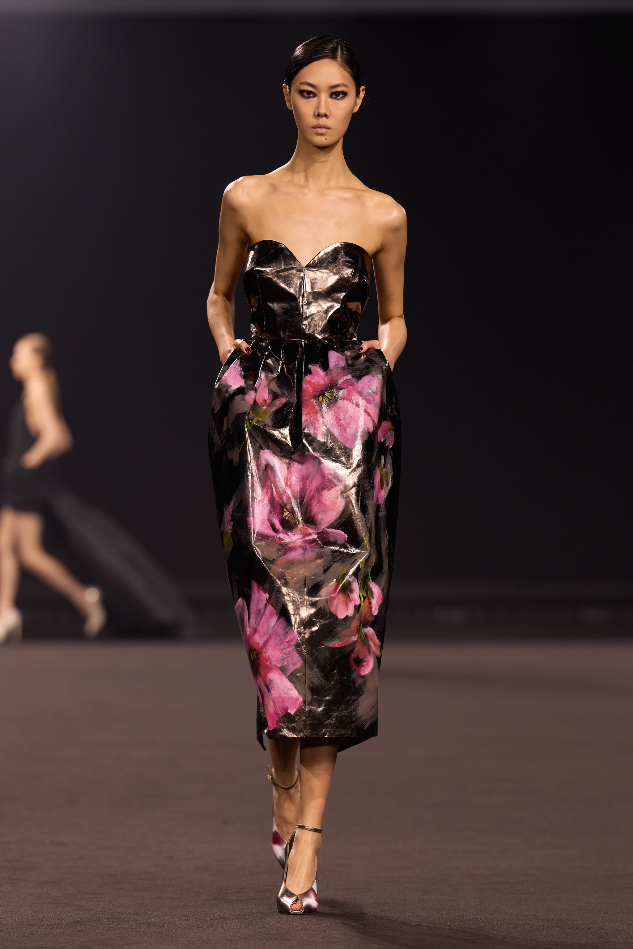 Una palette dominata da nero e marrone, capi in pelle a effetto cocco, decori in pizzo, drappeggi e tagli asimmetrici sfilano alla Paris Fashion Week sulla passerella Autunno/Inverno 2026-2027 di Elie Saab