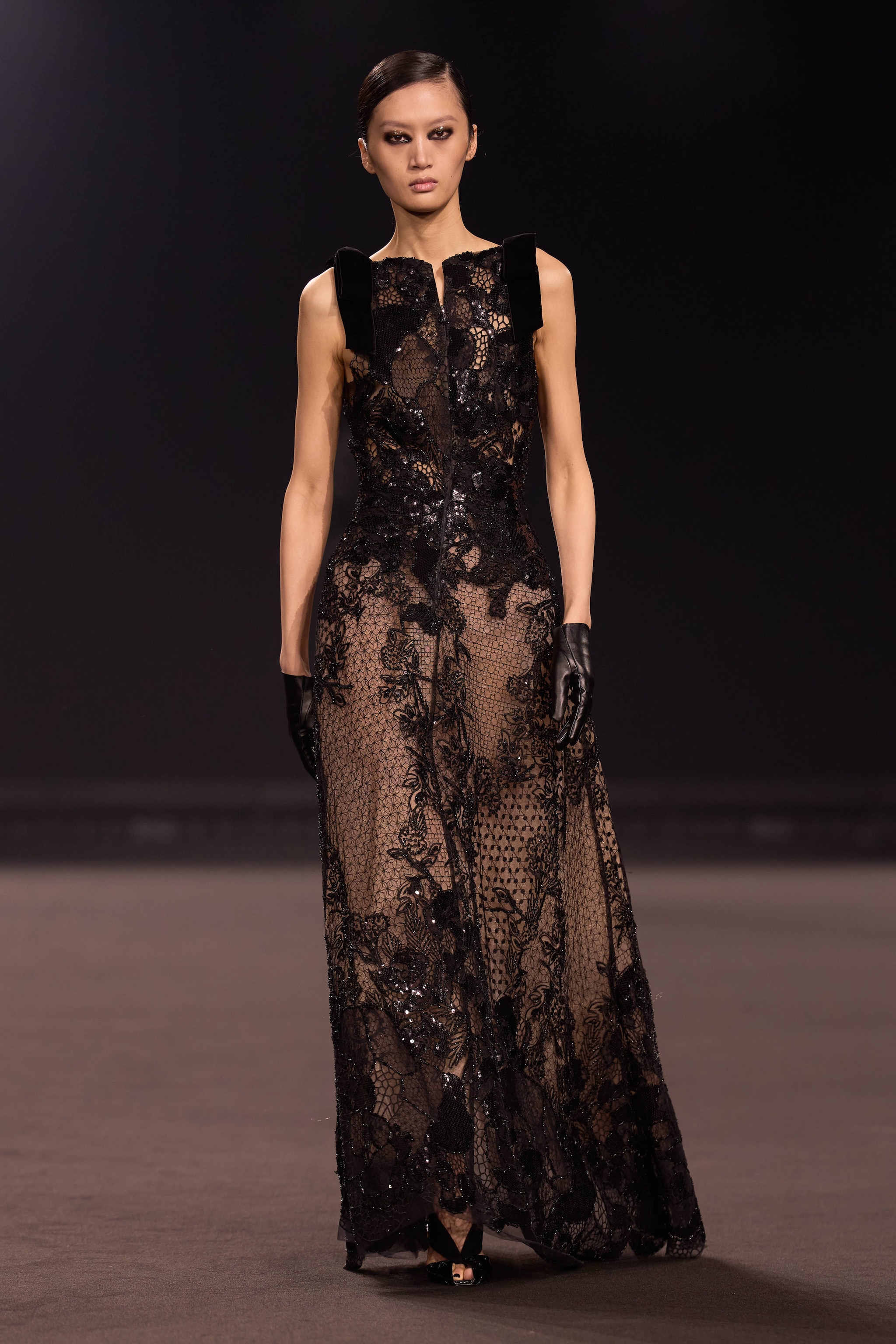 Una palette dominata da nero e marrone, capi in pelle a effetto cocco, decori in pizzo, drappeggi e tagli asimmetrici sfilano alla Paris Fashion Week sulla passerella Autunno/Inverno 2026-2027 di Elie Saab