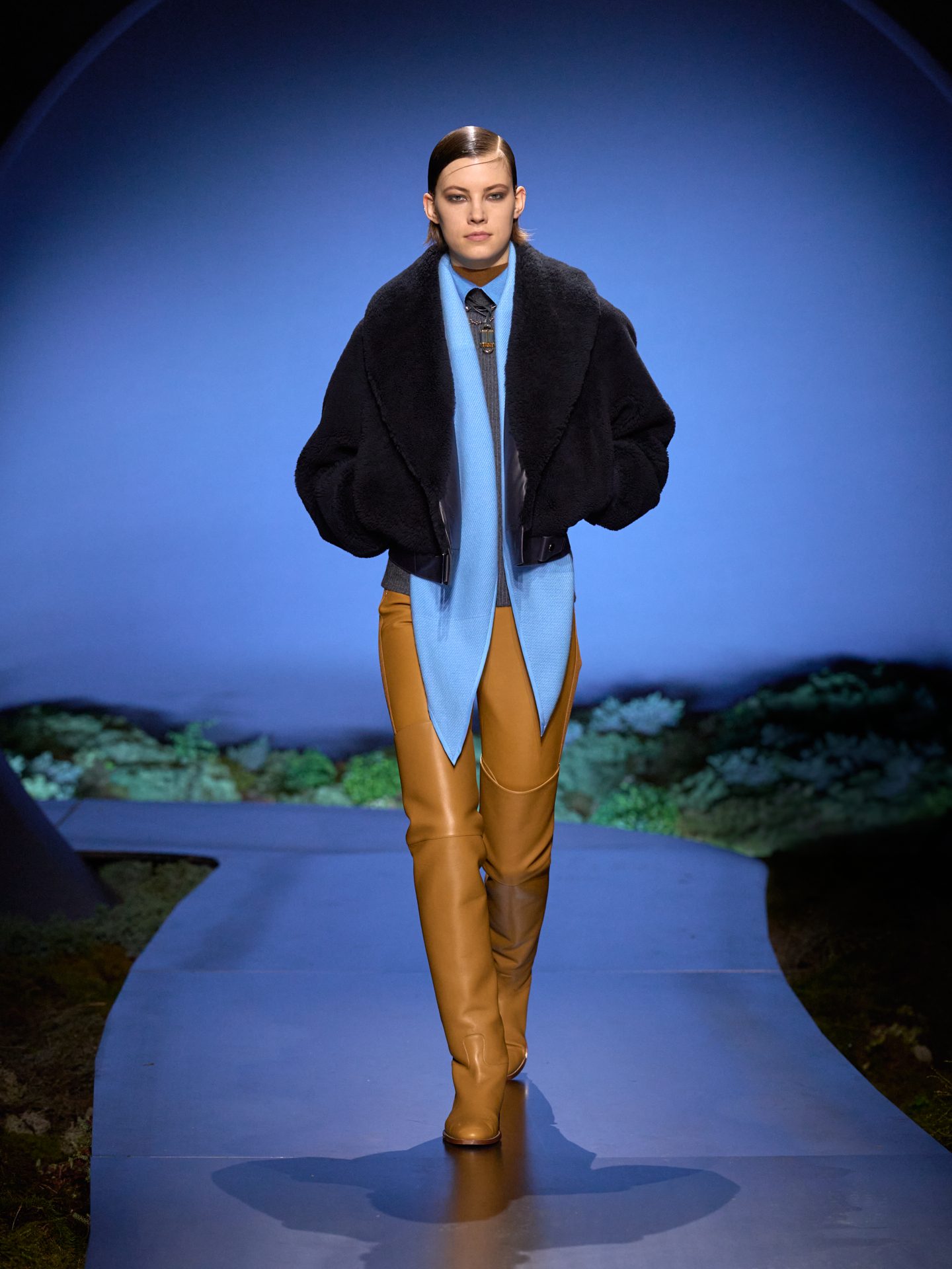 Jumpsuit aderenti, cappotti con inseti in pelle matelassé e giacche sciancrate sfilano alla Paris Fashion Week sulla passerella Autunno/Inverno 2026-2027 di Hermes