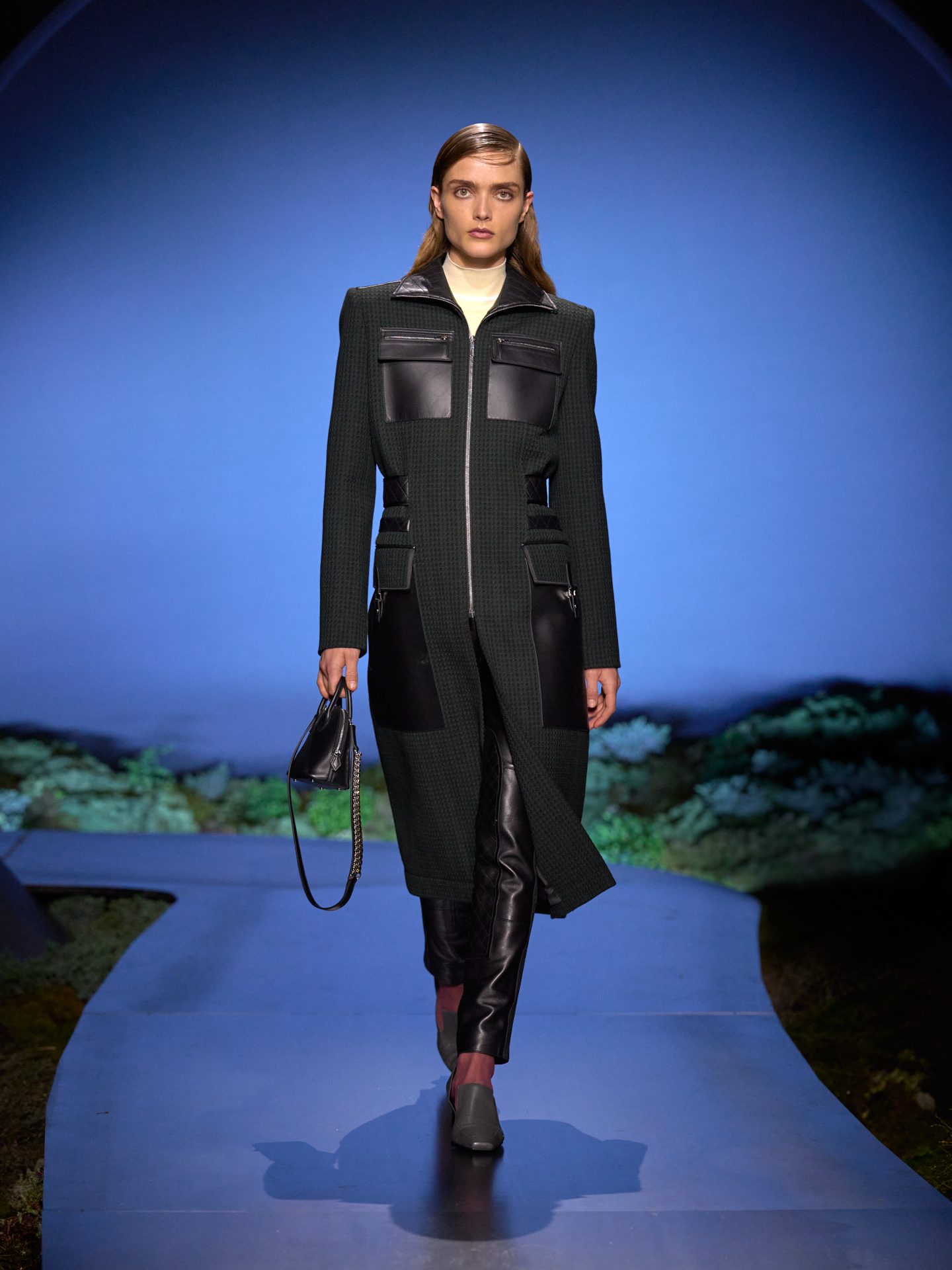Jumpsuit aderenti, cappotti con inseti in pelle matelassé e giacche sciancrate sfilano alla Paris Fashion Week sulla passerella Autunno/Inverno 2026-2027 di Hermes