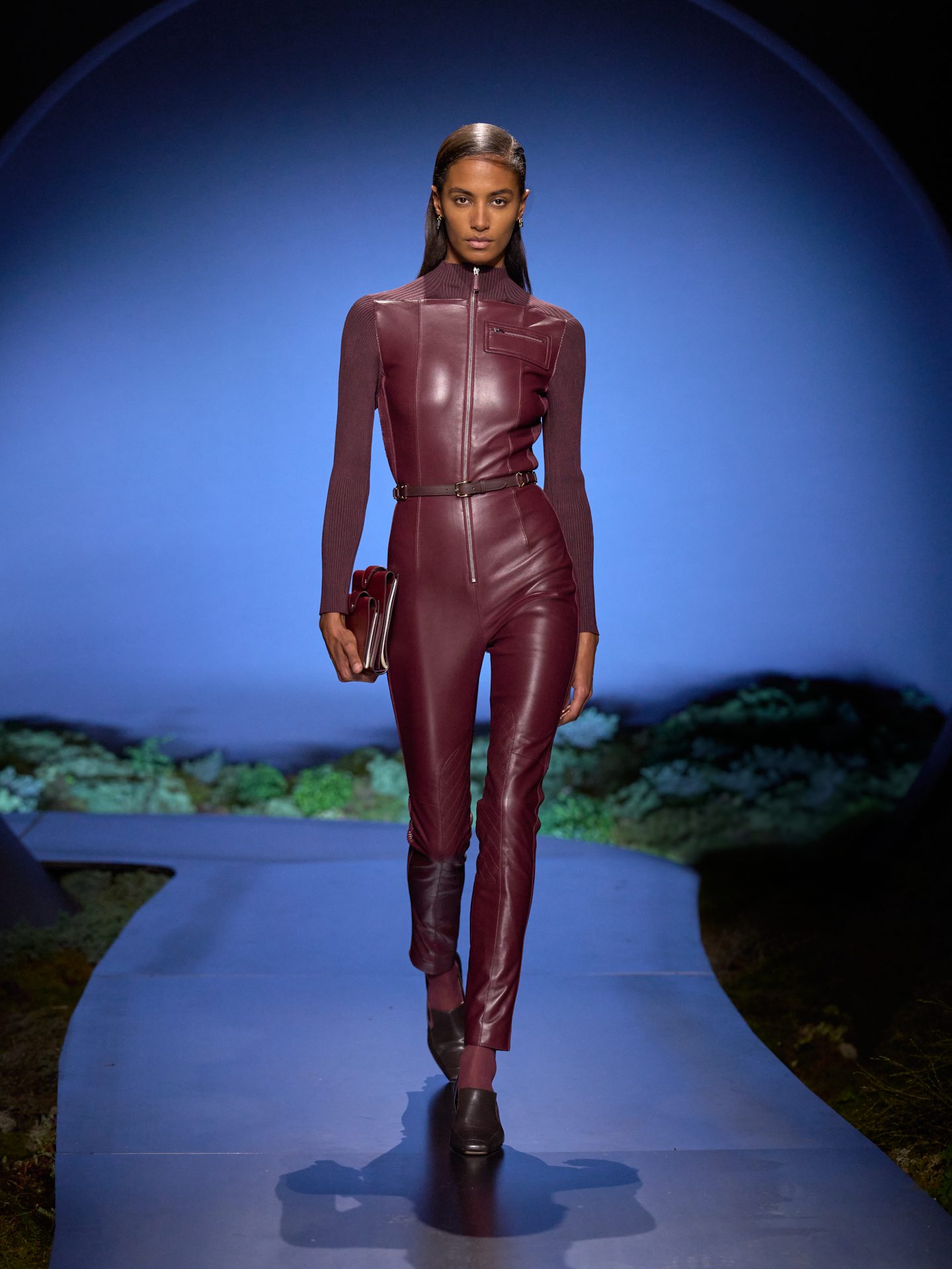 Jumpsuit aderenti, cappotti con inseti in pelle matelassé e giacche sciancrate sfilano alla Paris Fashion Week sulla passerella Autunno/Inverno 2026-2027 di Hermes